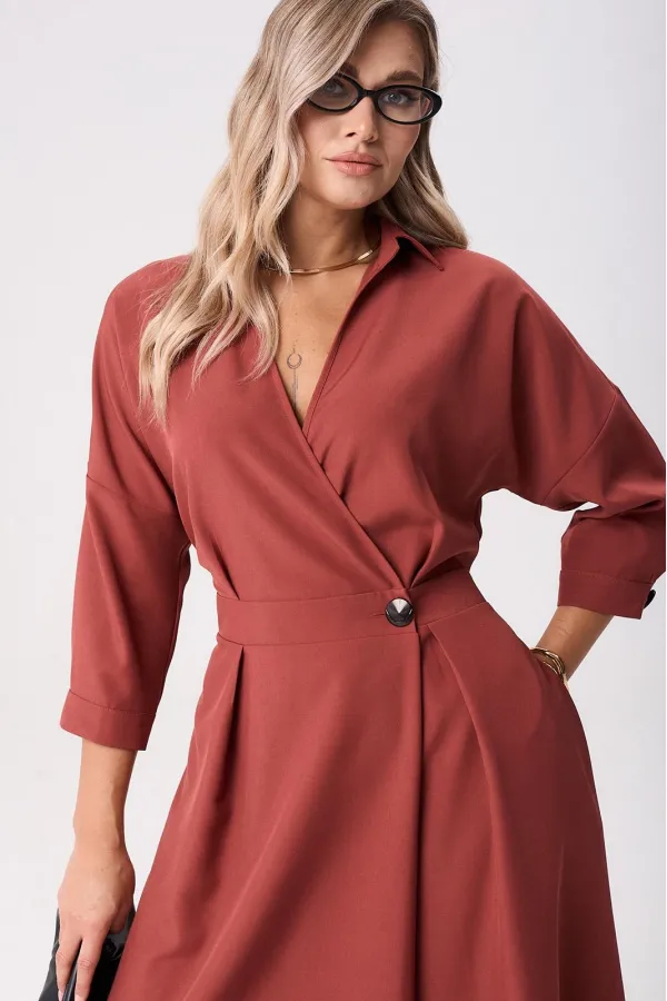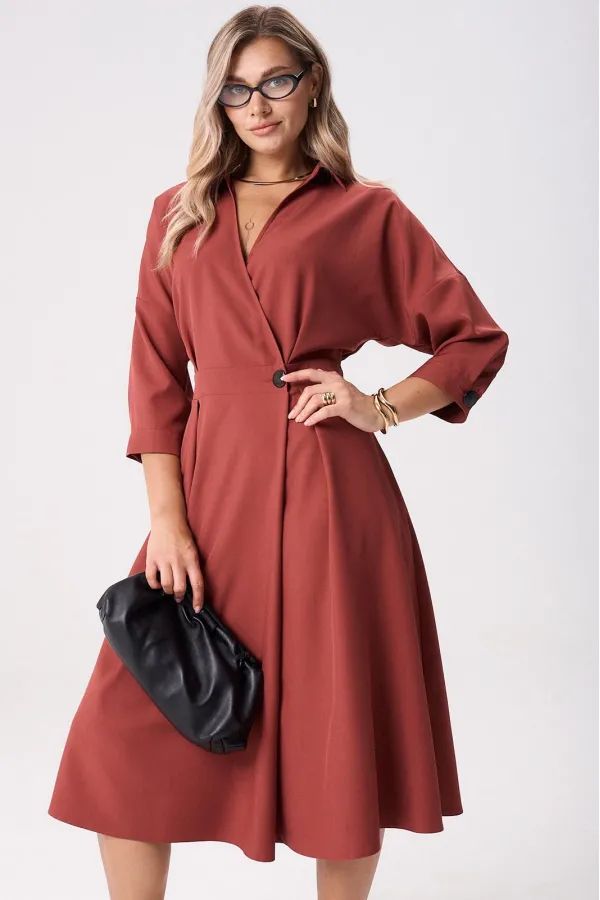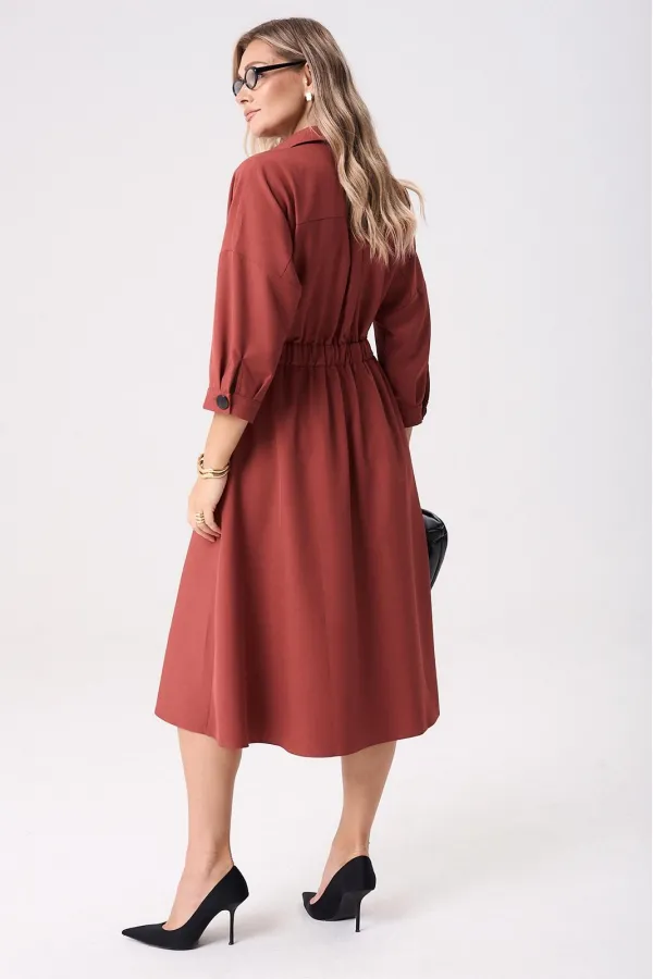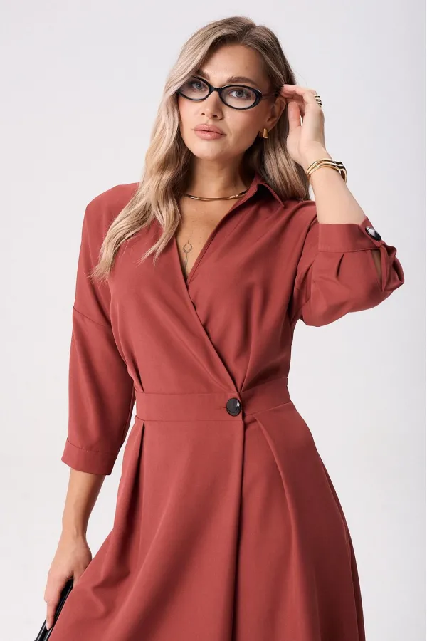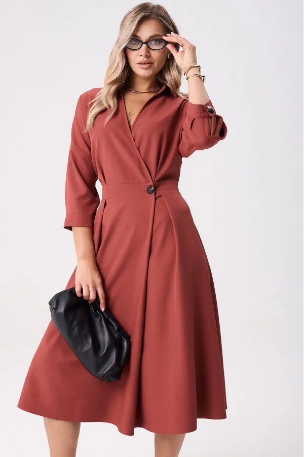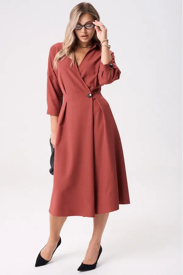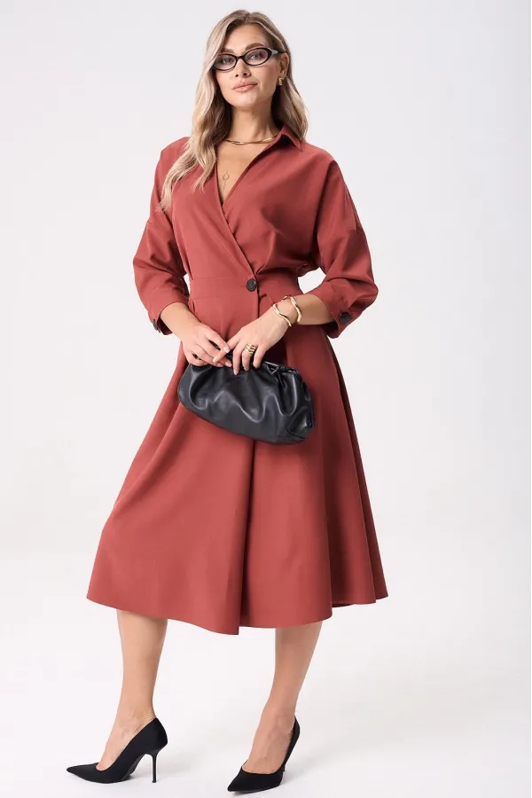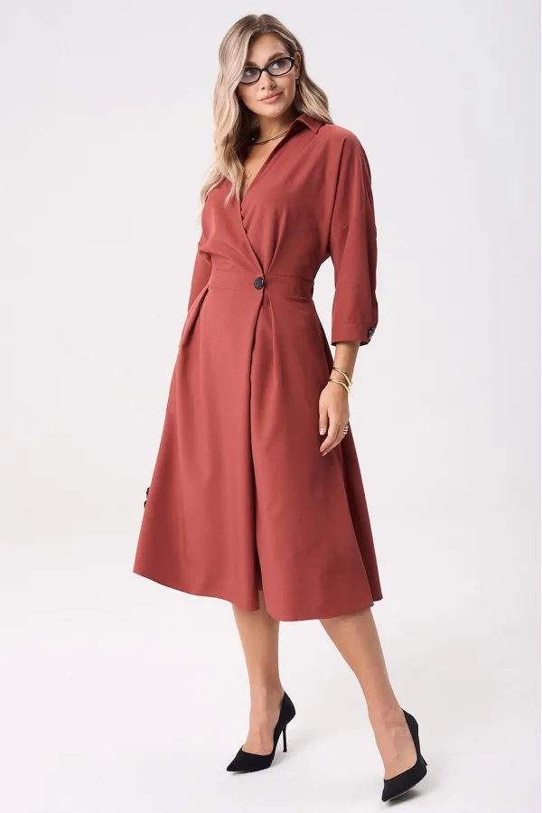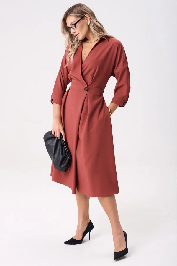 Элегантное женское палтье из костюмной ткани необычного кроя станет изюминкой вашего гардероба. Платье полуприлегающего силуэта, отрезное по линии талии со спущенным плечом. Рукав 3/4 длиный на отрезной манжете. По полочке идут защипы-складки в верхней и нижней частях, запах - на петли и пуговицы по подрезу. По нижней части платья запах идет в виде складки. По спинке кокетка со складкой, по подрезу вставлена резинка. Юбка-полусолнце с односторонними складками по полочке, по бокам карманы. По горловине воротник на отрезной стойке. Платье будет идеально смотреться с туфлями, ботинкаи и сапогами. Длина по спинке: 117см. Длина рукава с манжето 29см.