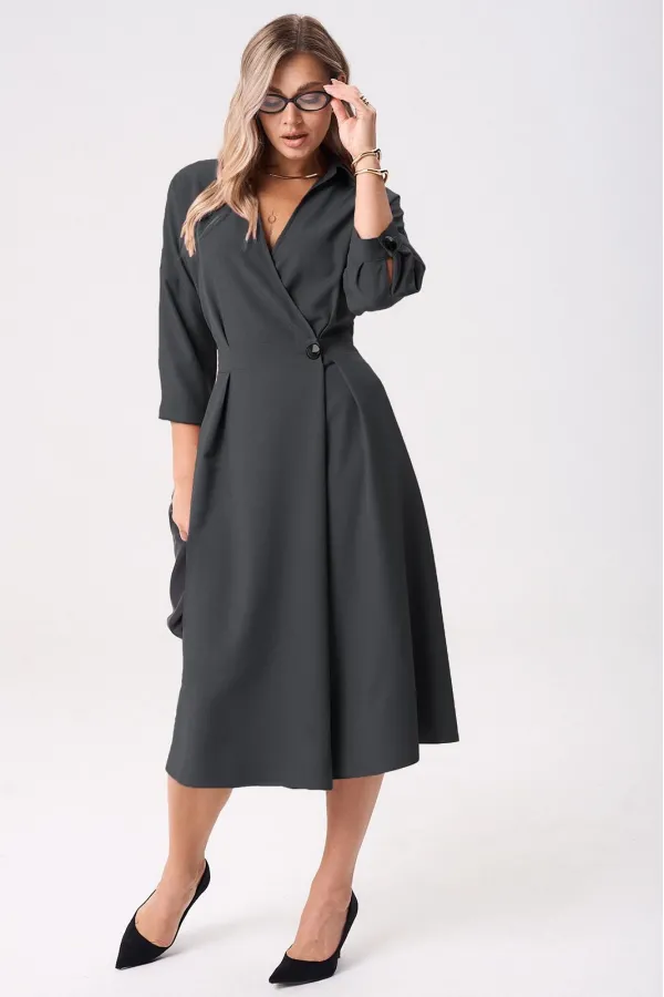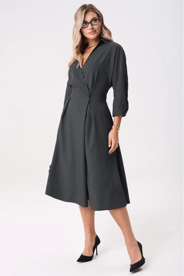 Элегантное женское палтье из костюмной ткани необычного кроя станет изюминкой вашего гардероба. Платье полуприлегающего силуэта, отрезное по линии талии со спущенным плечом. Рукав 3/4 длиный на отрезной манжете. По полочке идут защипы-складки в верхней и нижней частях, запах - на петли и пуговицы по подрезу. По нижней части платья запах идет в виде складки. По спинке кокетка со складкой, по подрезу вставлена резинка. Юбка-полусолнце с односторонними складками по полочке, по бокам карманы. По горловине воротник на отрезной стойке. Платье будет идеально смотреться с туфлями, ботинкаи и сапогами. Длина по спинке: 117см. Длина рукава с манжето 29см.
