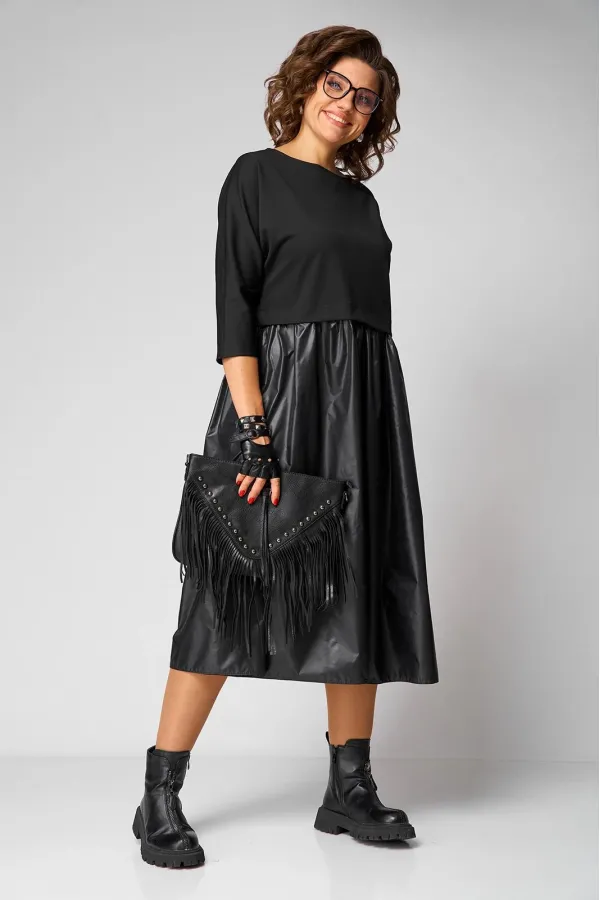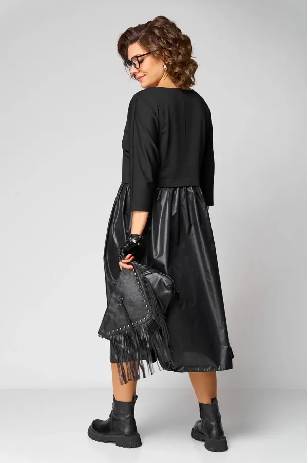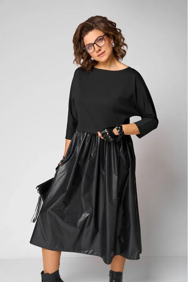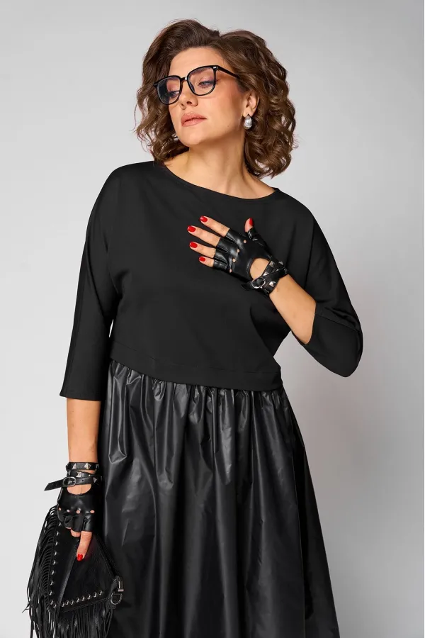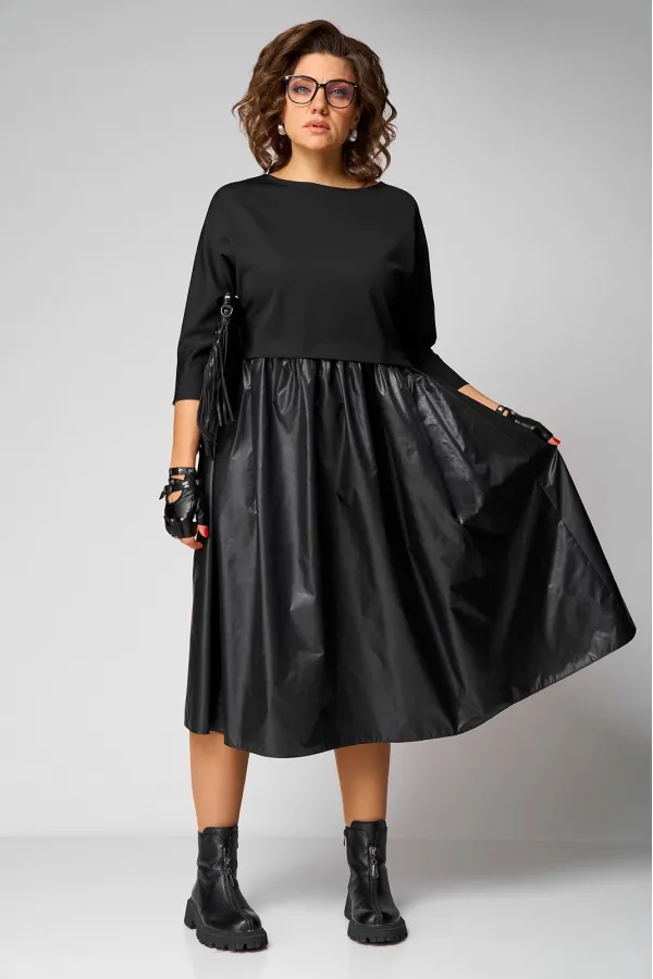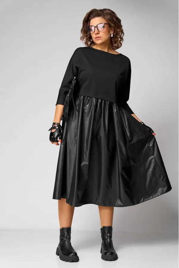 Создайте свой неповторимый образ с этим оригинальным женским платьем от Anastasia! Оно имеет удивительно комфортный крой, который скроет все недостатки фигуры. Идеальный вариант как для повседневной носки, так и для праздничного выхода, достаточно дополнить его соответствущими аксессуарами. Платье женское из двух видов ткани. Платье отрезное по линии талии со сборкой. Рукав 3/4 длины , летучая мышь. По спинке - средний шов. Благодаря свободному крою платье отлично сядет на любую фигуру. Длина платья (по спинке):(48-52) 115см., (54-58)-120 см. Длина рукава от головины: (48-58)-55см.