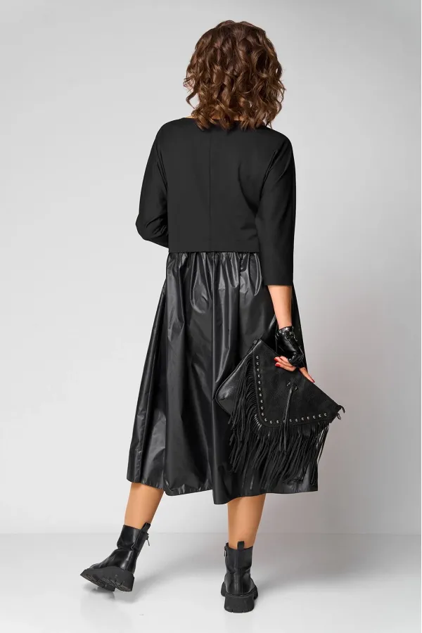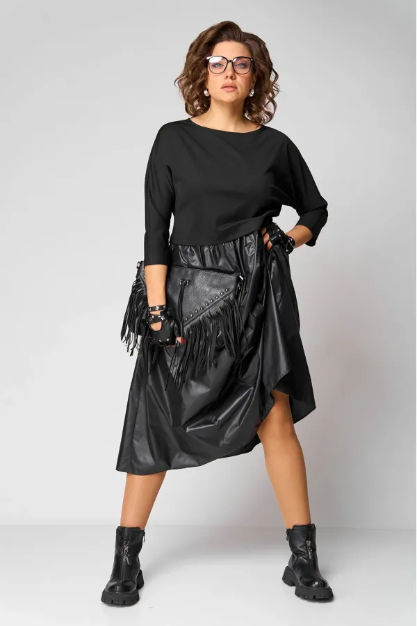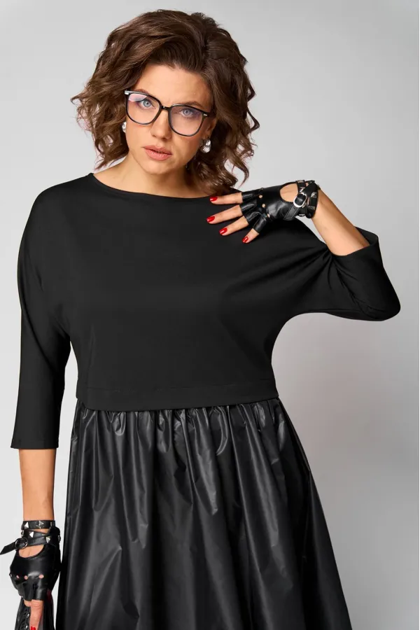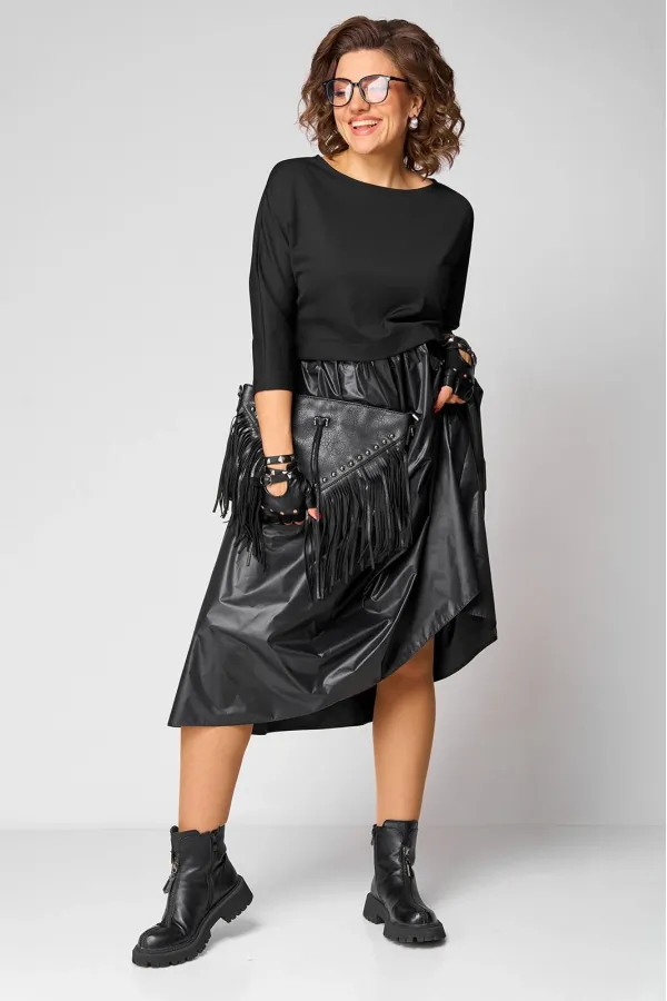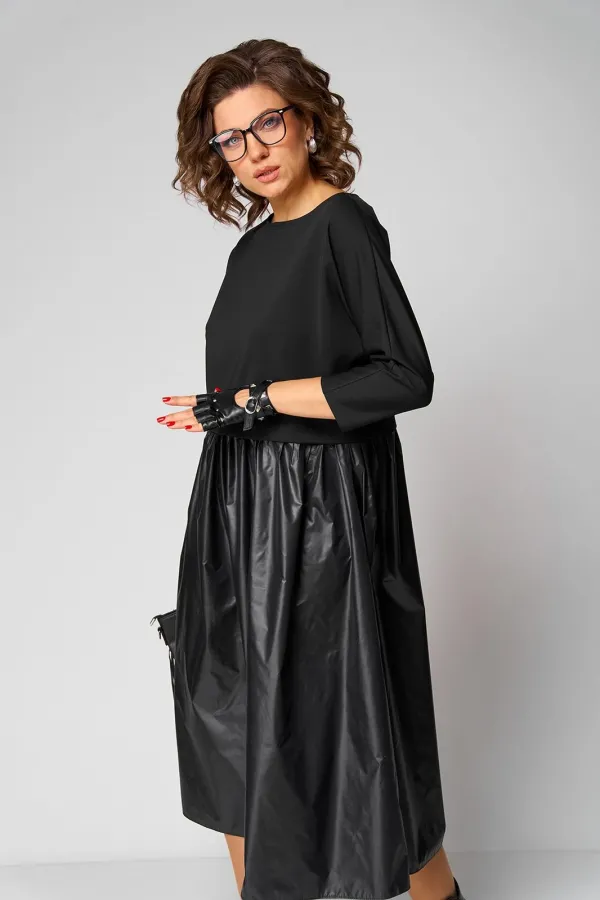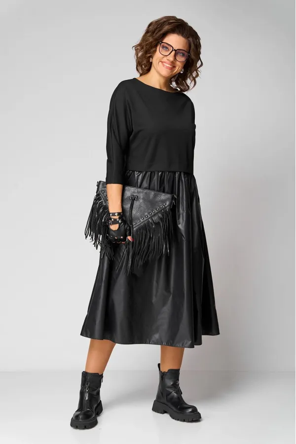 Создайте свой неповторимый образ с этим оригинальным женским платьем от Anastasia! Оно имеет удивительно комфортный крой, который скроет все недостатки фигуры. Идеальный вариант как для повседневной носки, так и для праздничного выхода, достаточно дополнить его соответствущими аксессуарами. Платье женское из двух видов ткани. Платье отрезное по линии талии со сборкой. Рукав 3/4 длины , летучая мышь. По спинке - средний шов. Благодаря свободному крою платье отлично сядет на любую фигуру. Длина платья (по спинке):(48-52) 115см., (54-58)-120 см. Длина рукава от головины: (48-58)-55см.