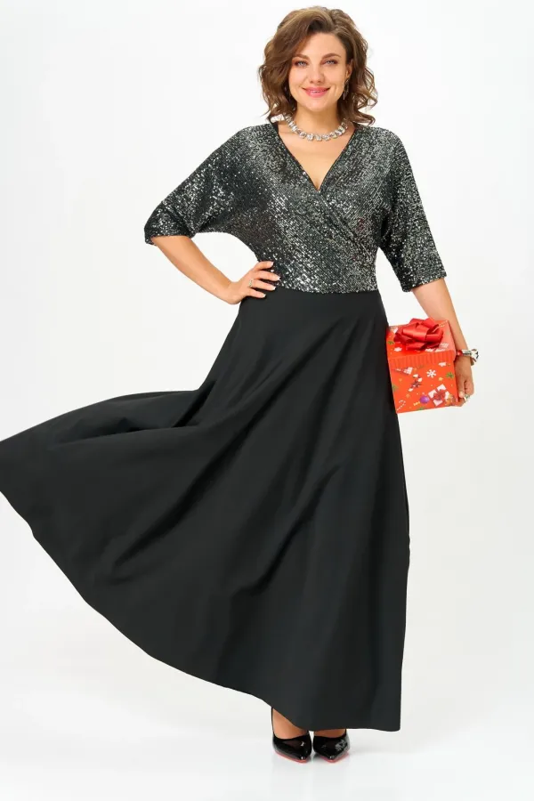 Элегантное женское платье из двух видов ткани: пайетки и текстиль- иделаный выбор на Новый год и другие торжественные мароприятия. Отрезное по линии талии. Благодаря своему крою прекрасно будет смотреться на любой фигуре, скрывая недостатки. Юбка-солнце-клеш. Верхняя часть со свободным рукавом летучая мышь, на подкладке из стрейчевой сетки. Благодаря этому платье не колется. В правом боковом шве лифа - отверствие для пояса,который протягивается и завязывается по спинке. Прилегание платья регулируется запахом и поясом. Длина по спинке: верхняя часть -40см, юбка -106см. Длина рукава о горловины - 46 см.
