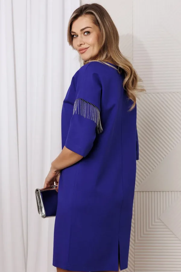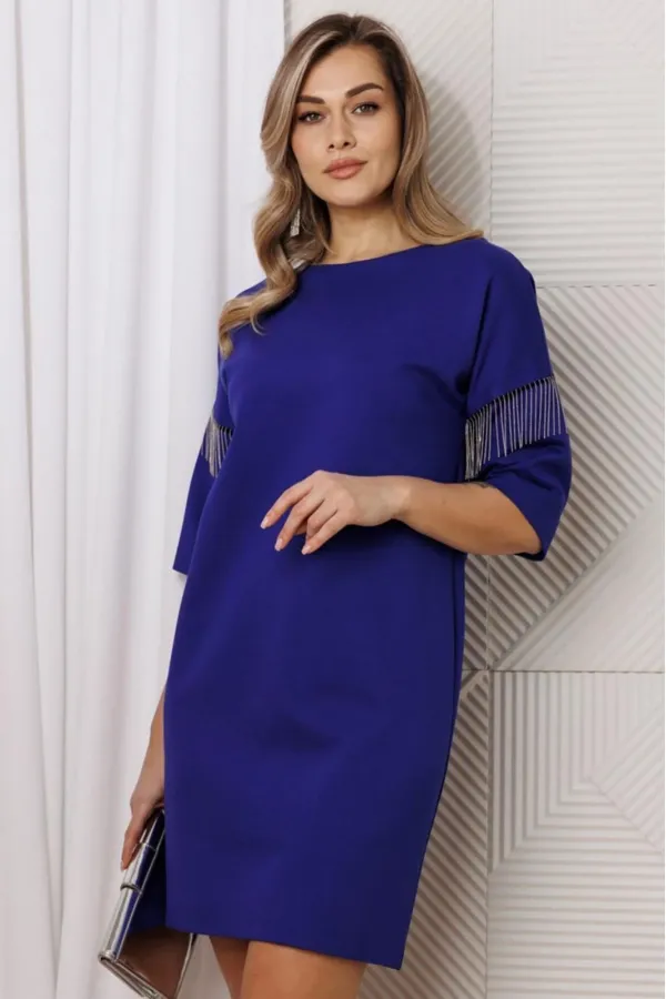 Элегантное платье прямного силуэта из плотного трикотажного полотна. Ткань не мнется. Благодаря своему крою подойдёт для разных типов фигуры. Оно подчеркнёт вашу индивидуальность и станет отличным дополнением к вашему гардеробу. В нём вы будете чувствовать себя уверенно и комфортно, зная, что выглядите на все сто. Выбирая его, вы выбираете качество, комфорт и стиль. Классическое платье прямого силуэта, со спущенным плечом. В качестве декора металлизированная бахрома на рукавах. По спинке идет средний шов. Длина платья по спинке (48-52) - 91см, (54-58) - 95 см, (60-64)-101. Длина рукава: (48-64) - 23 см.