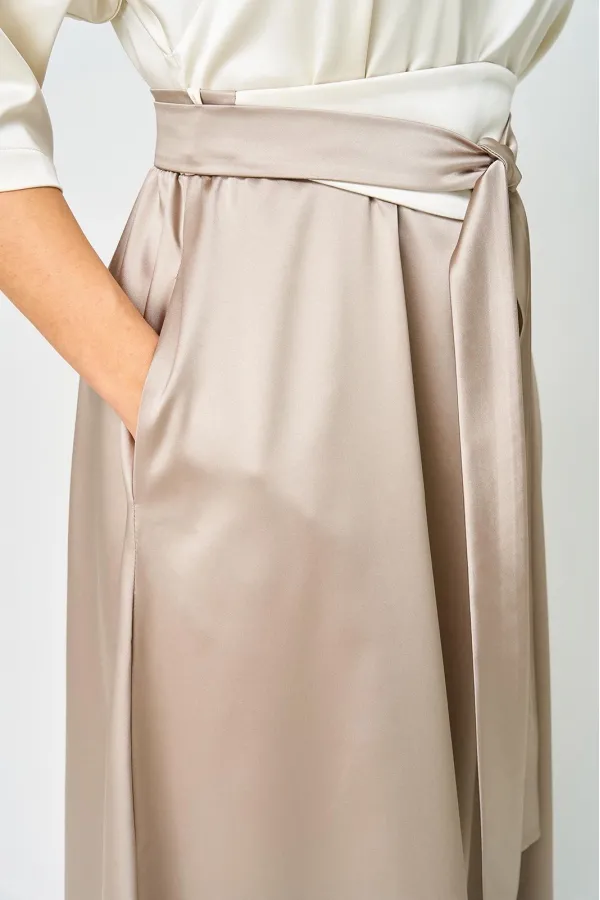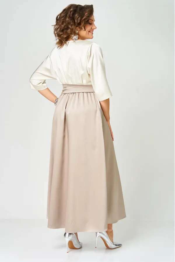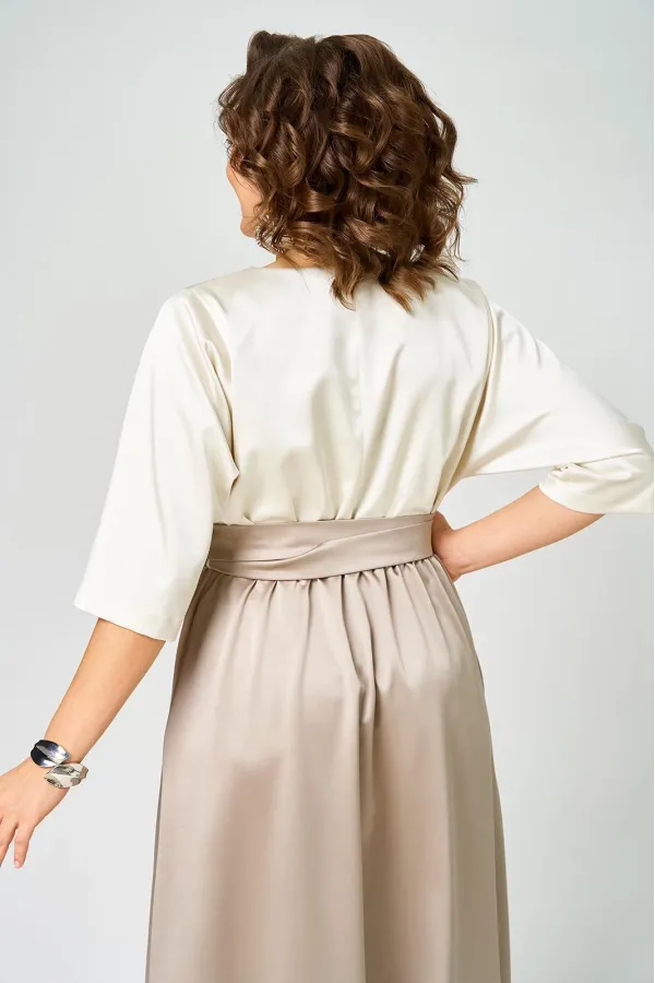 Платье выполнено из однотонной ткани с атласным эффектом в сочетании двух цветов. Платье длинной макси с акцентом в области талии в виде съемного пояса кушак. Платье отрезное по линии талии. Полочка с горловиной овальной формы. Спинка со средним швом, в верхней части которого обработана капля-разрез с застежкой на навесную петлю и пуговицу. Рукав одношовный длиной 3/4. Юбка формы колокол. В боковых швах юбки обработаны карманы. По талии платье с эластичной тесьмой. В боковых швах лифа обработаны шлёвки, через которые продевается пояс-кушак.Параметры изделия представлены на фото.