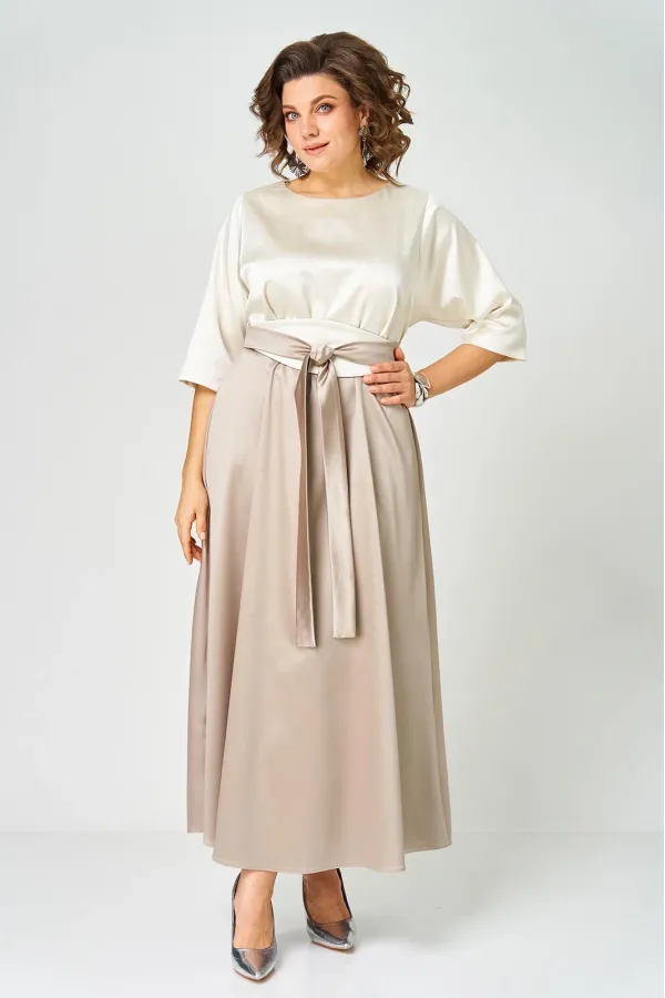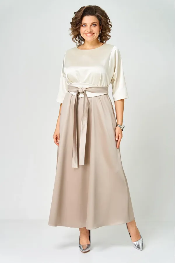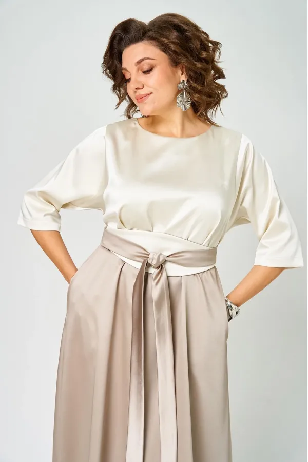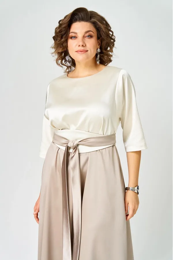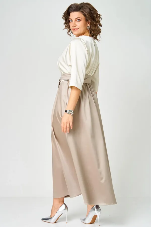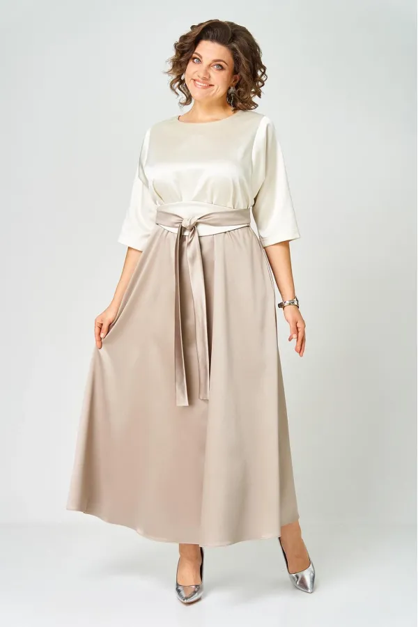 Платье выполнено из однотонной ткани с атласным эффектом в сочетании двух цветов. Платье длинной макси с акцентом в области талии в виде съемного пояса кушак. Платье отрезное по линии талии. Полочка с горловиной овальной... Читать далее...