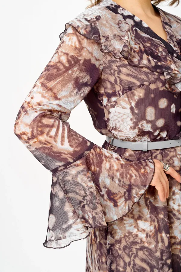 Платье отрезное по линии талии. Полочка лифа с нагрудными вытачками и центральной планкой с застежкой на петли и пуговицы. Горловина V-образной формы, обработана воротником в виде рюши. Спинка лифа цельная. Рукав длинный, втачной, одношовный, низ рукава обработан притачным воланом. Юбка обьемная со складками по талии и на резинке. Низ юбки с притачным двойным воланом. Платье по талии с готовым поясом.