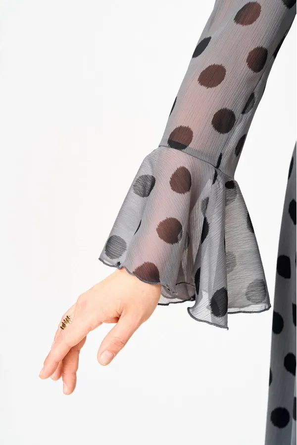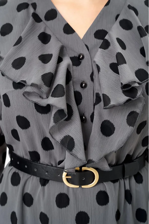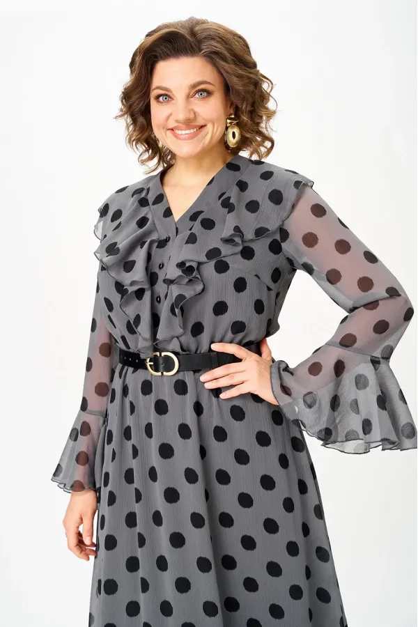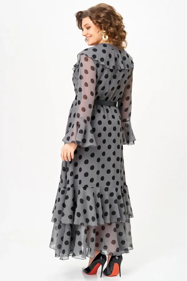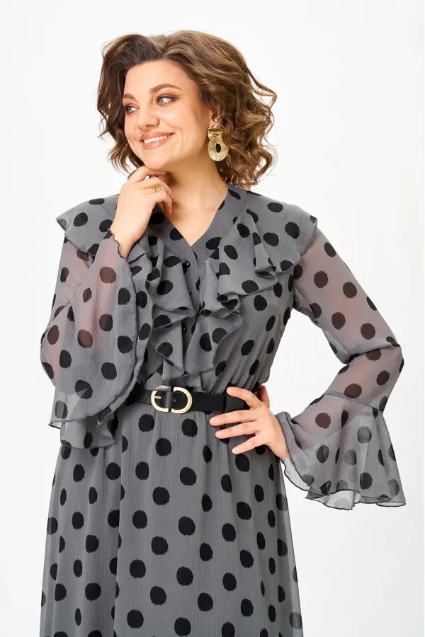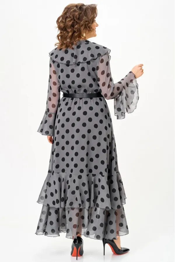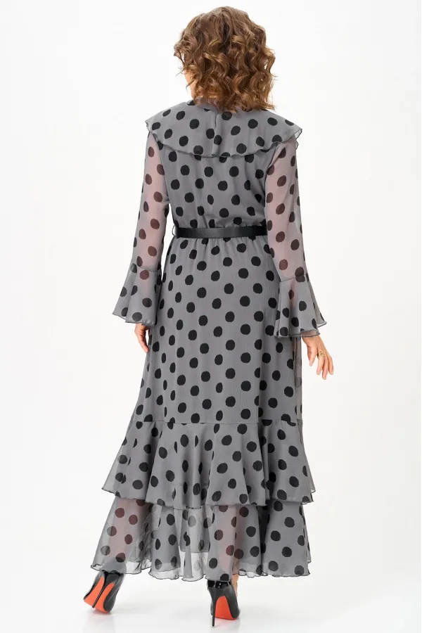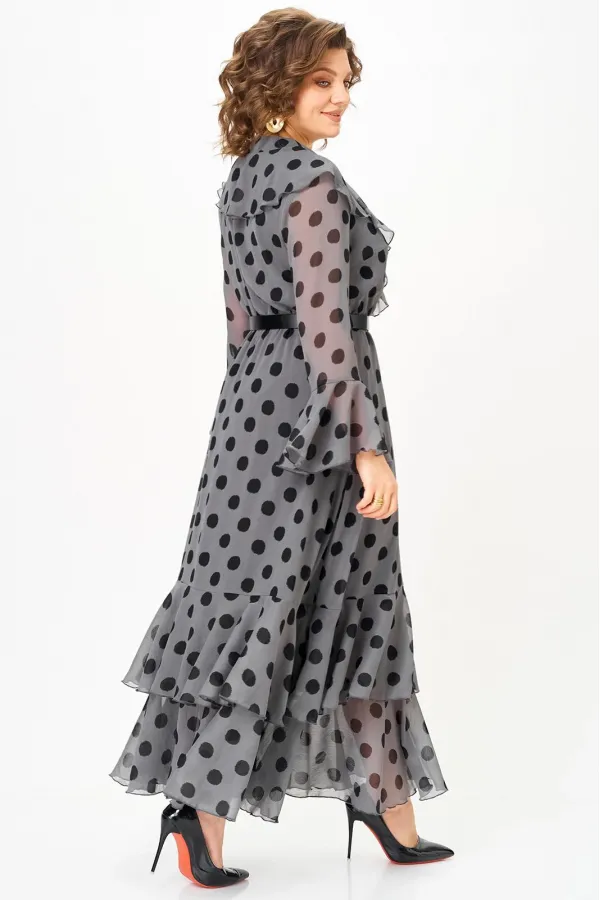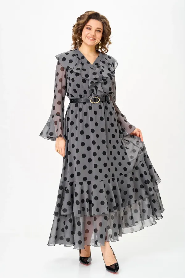 Платье отрезное по линии талии. Полочка лифа с нагрудными вытачками и центральной планкой с застежкой на петли и пуговицы. Горловина V-образной формы, обработана воротником в виде рюши. Спинка лифа цельная. Рукав длинный, втачной, одношовный, низ рукава обработан притачным воланом. Юбка обьемная со складками по талии и на резинке. Низ юбки с притачным двойным воланом. Платье по талии с готовым поясом.