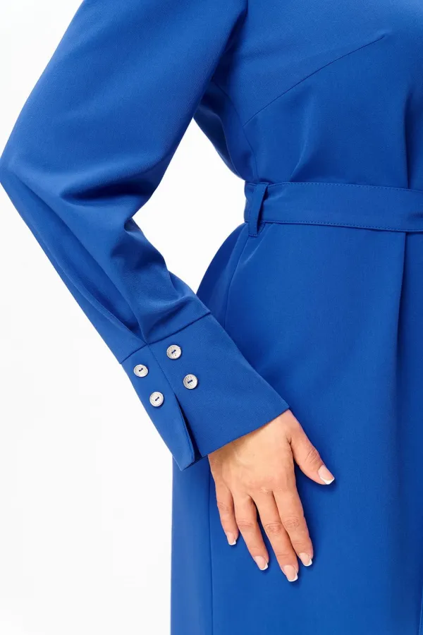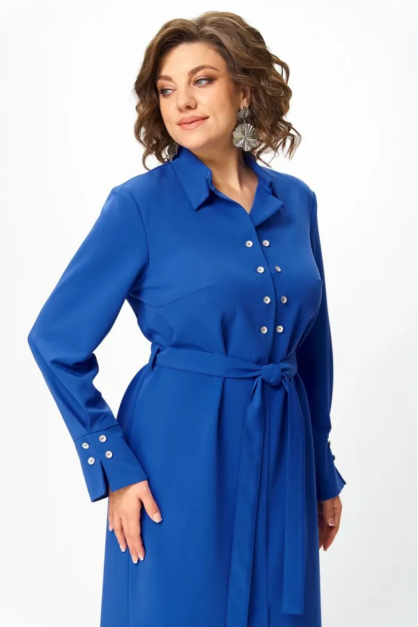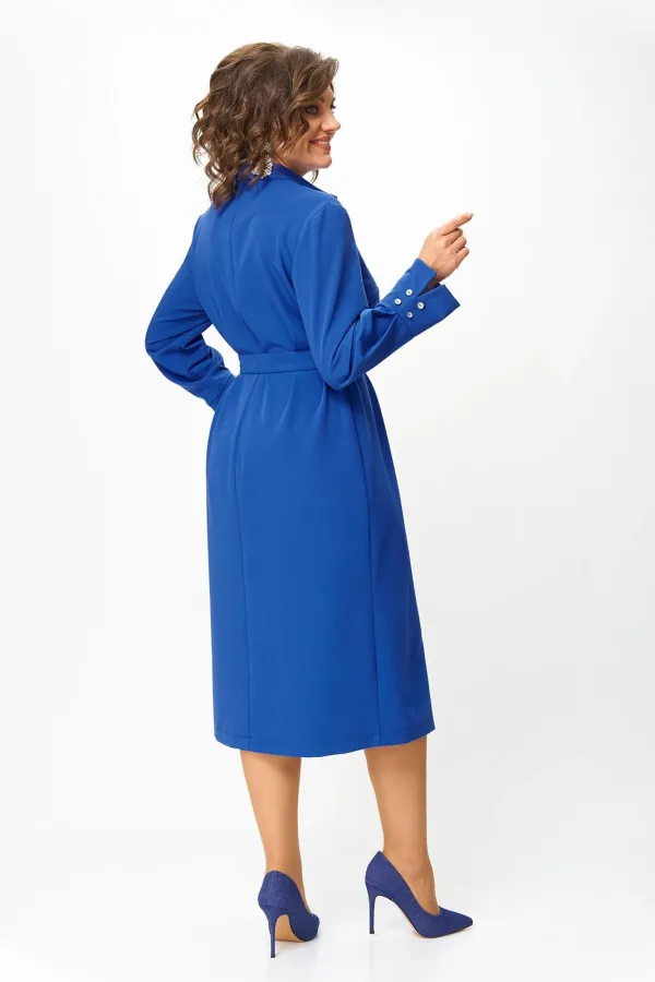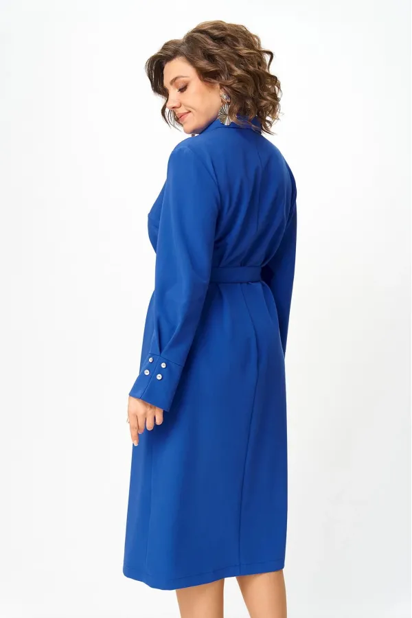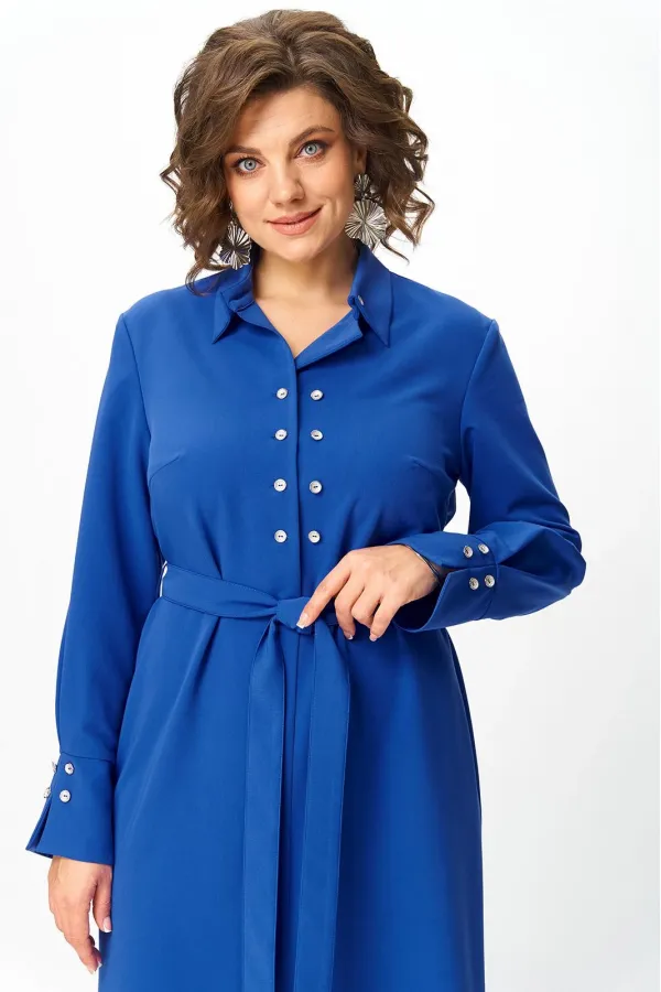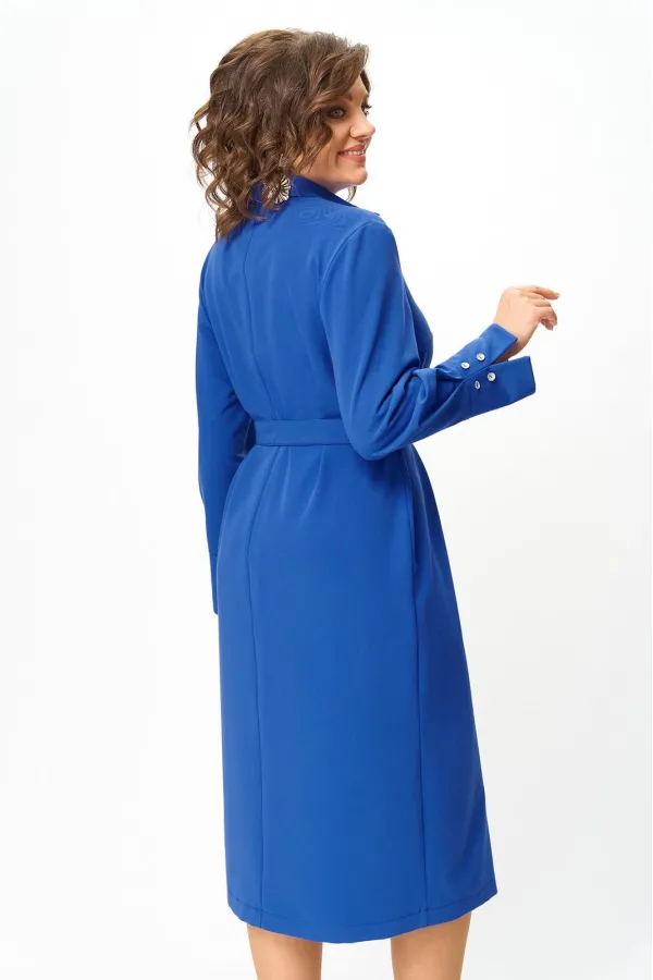 Полочка платья с центральным швом, в верхней части которого выполнена оригинальная застежка на петли и пуговицы, в нижней части центрального шва полочки обработана шлица. Полочка с нагрудными вытачками. Горловина круглой формы с воротником рубашечного типа. Спинка со средним швом. Рукав втачной, одношовный, длинный, по низу со складкой и притачной манжетой. Манжета с разрезом по низу и декором из пуговиц.