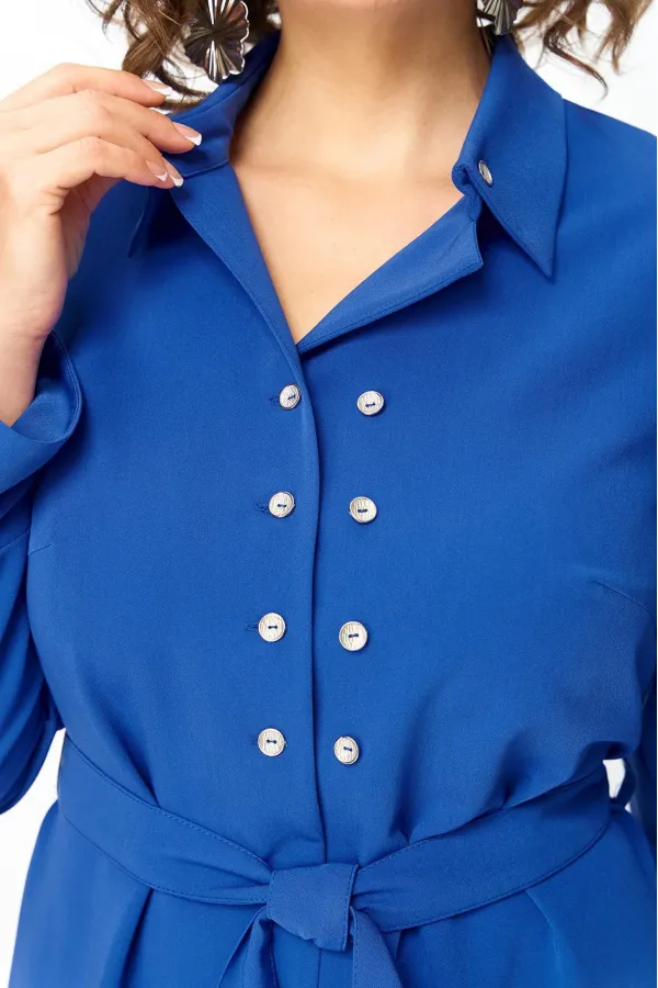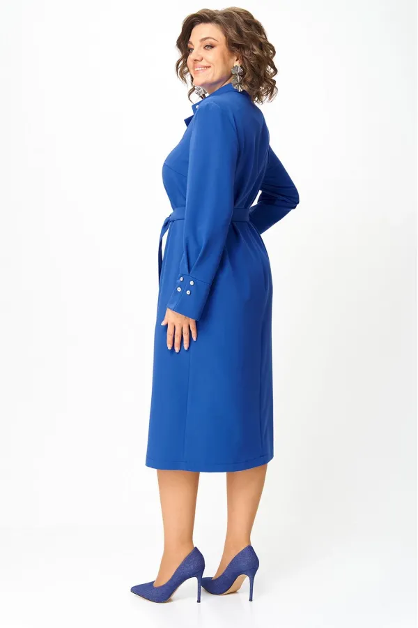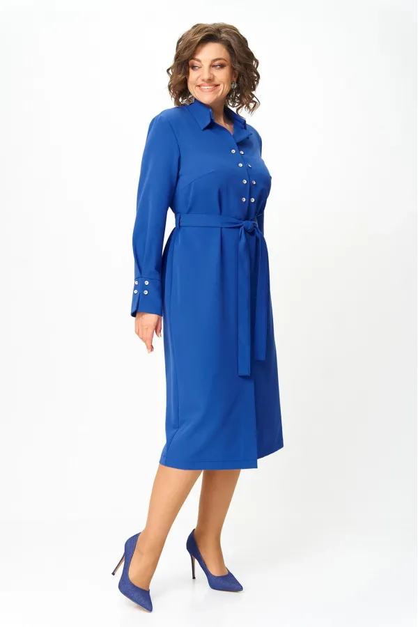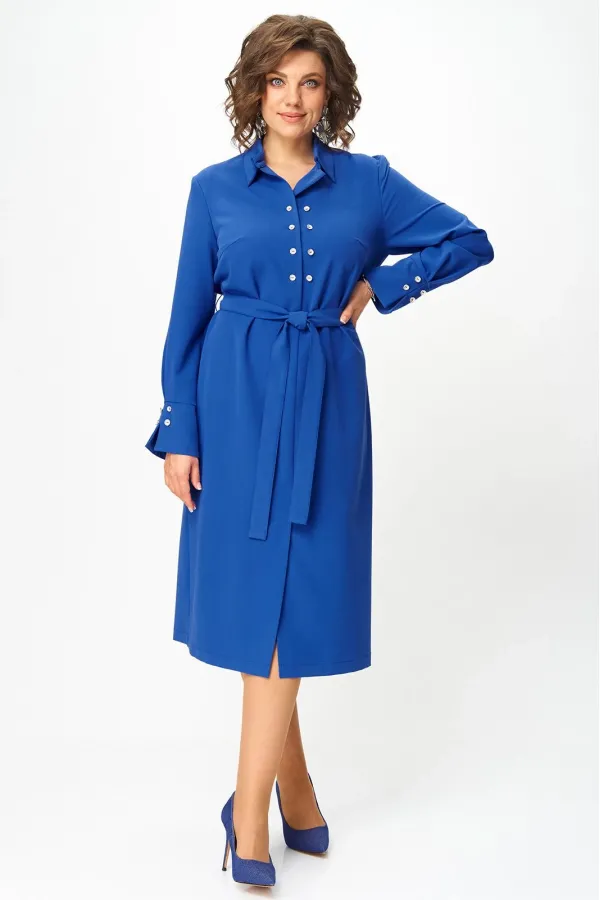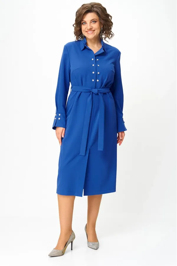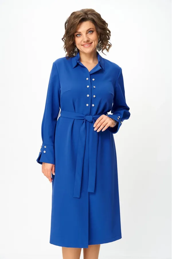 Полочка платья с центральным швом, в верхней части которого выполнена оригинальная застежка на петли и пуговицы, в нижней части центрального шва полочки обработана шлица. Полочка с нагрудными вытачками. Горловина круглой формы с воротником рубашечного типа. Спинка со средним швом. Рукав втачной, одношовный, длинный, по низу со складкой и притачной манжетой. Манжета с разрезом по низу и декором из пуговиц.