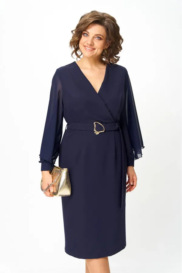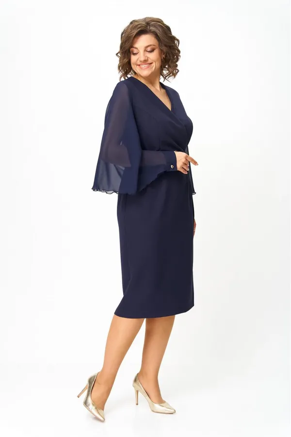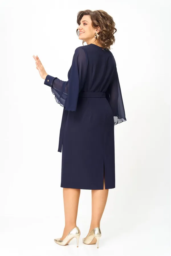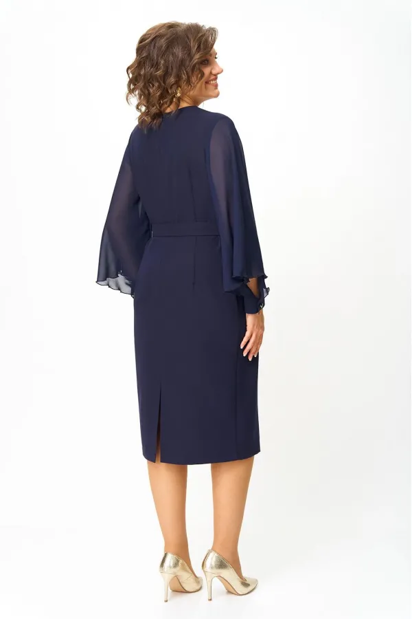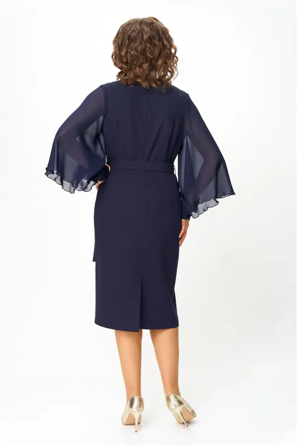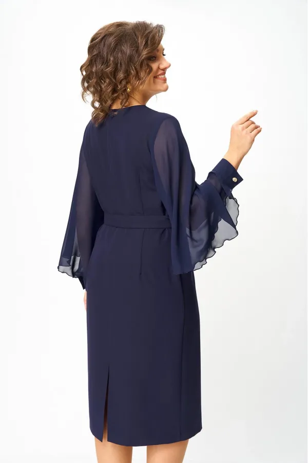 Платье длиной за колено, полуприлегающего силуэта, выполнено из однотонной ткани костюмно-плательной группы в сочетании с полупрозрачным однотонным шифоном.