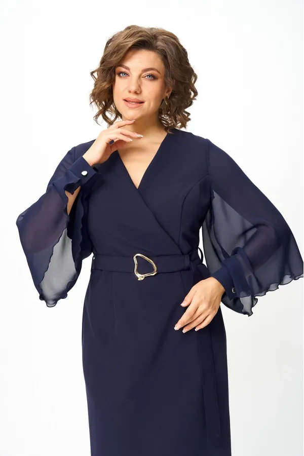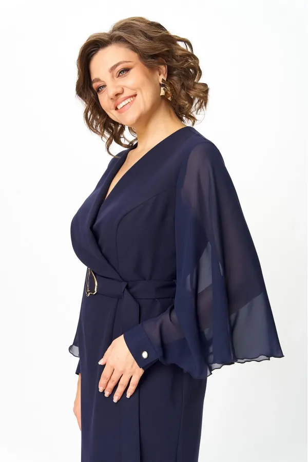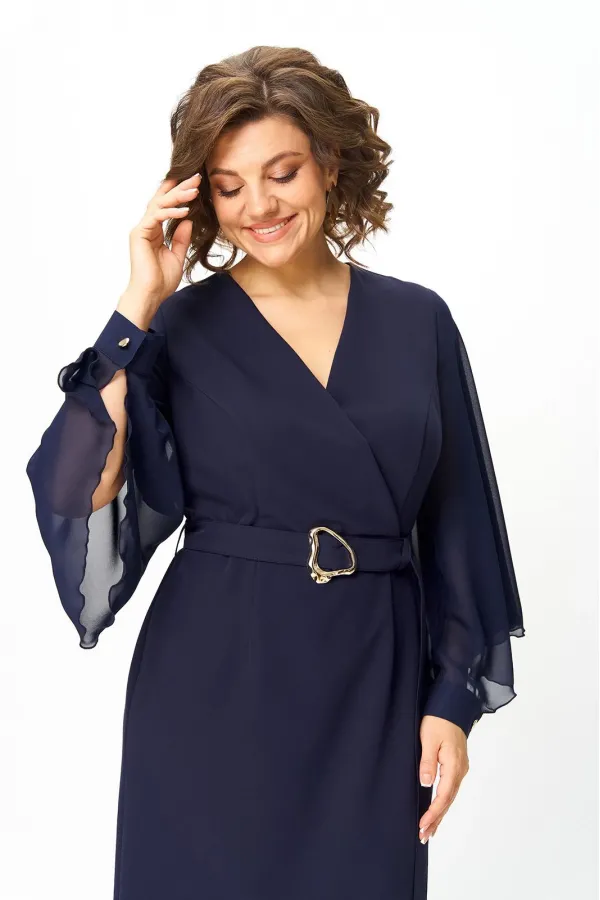Полочка разрезная по линии талии, лиф платья с имитацией запаха и отрезными бочками. Горловина V-образной формы. Нижняя часть полки с талиевыми вытачками. Спинка со средним швом, в верхней части которого обработана потайная молния, в нижней части разрез. Спинка с талиевыми вытачками. По боковым швам в области талии настрочены шлевки, через которые продет пояс, крепящийся спереди на пряжку. Рукав платья выполнен из шифона. Рукав длинный, одношовный, с драпировкой, обьемный к низу. Низ рукава на притачной манжете с застежкой на петлю и пуговицуПараметры изделия представлены на фото.