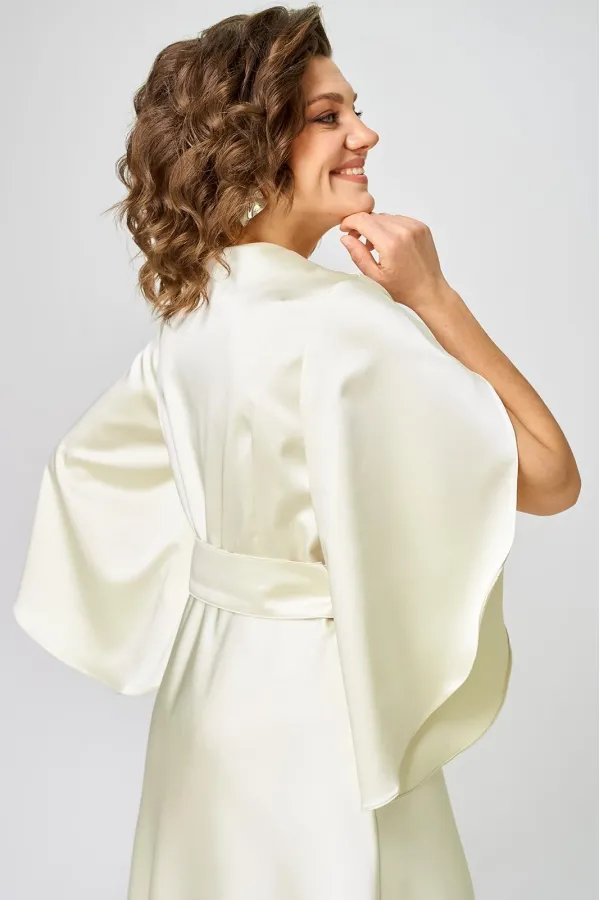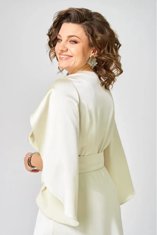 Платье отрезное по линии талии. Полочка с иммитацией запаха и складками по линии талии. Горловина V-образной формы. Спинка с талиевыми вытачками. Рукав втачной, обьемный к низу, с драпировкой. Юбка полуприлегающая по бедрам, свободная и широкая по низу. По боковым швам в области талии настрочены шлевки, через которые продет пояс, крепящийся на пуговицу.