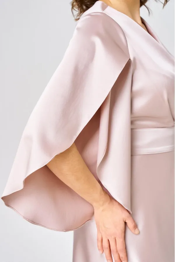 Платье отрезное по линии талии. Полочка с иммитацией запаха и складками по линии талии. Горловина V-образной формы. Спинка с талиевыми вытачками. Рукав втачной, обьемный к низу, с драпировкой. Юбка полуприлегающая по бедрам, свободная и широкая по низу. По боковым швам в области талии настрочены шлевки, через которые продет пояс, крепящийся на пуговицу.