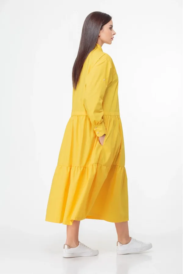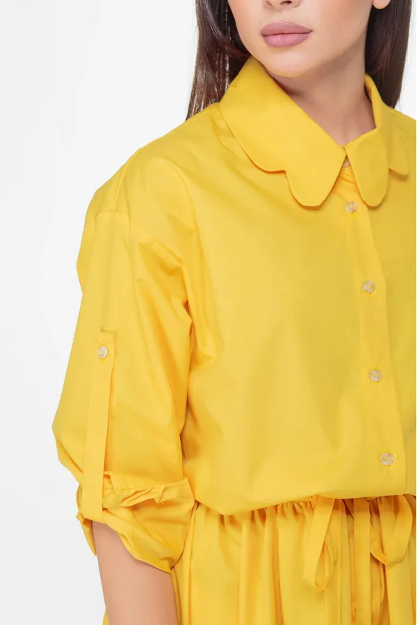 Расширенный крой, слегка заниженная талия, подчёркнута кулиской с завязывающимся поясом, втачные длинные рукава с фигурными манжетами и возможностью регулировать длину. Нижняя часть с двумя присборенными воланами. Фигурный воротник рубашечного кроя, застёжка на пуговицы до уровня талии.