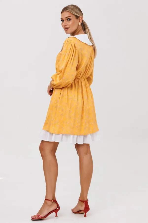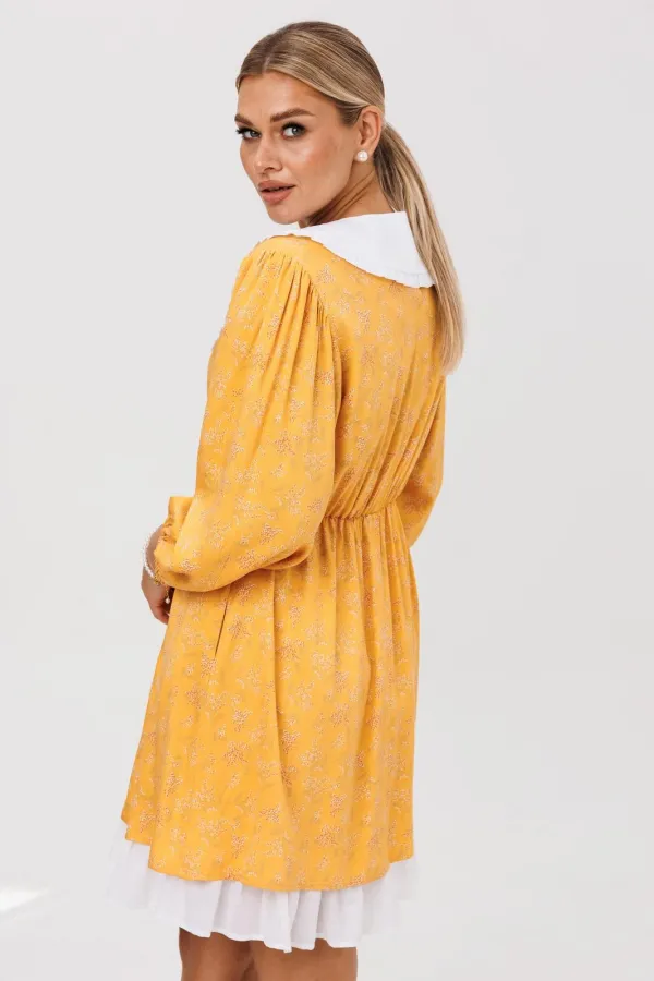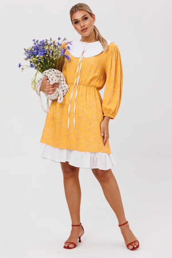 Яркий желтый оттенок с цветочным принтом «одуванчик» наполняет образ свежестью и легкостью, создавая настроение весны и солнечных прогулок. Съемный хлопковый воротник и подъюбник делают модель особенно практичной - их можно носить отдельно, комбинируя с другими элементами гардероба и создавая новые образы.