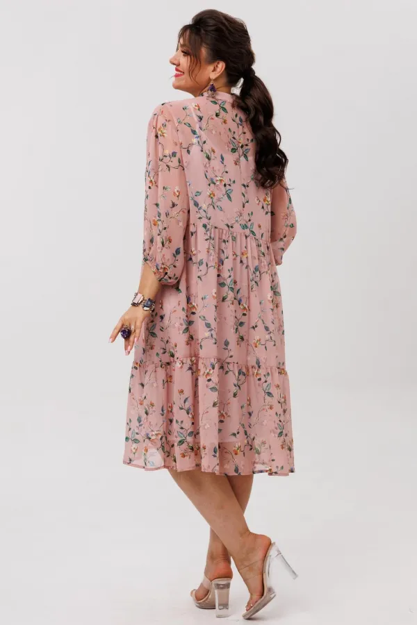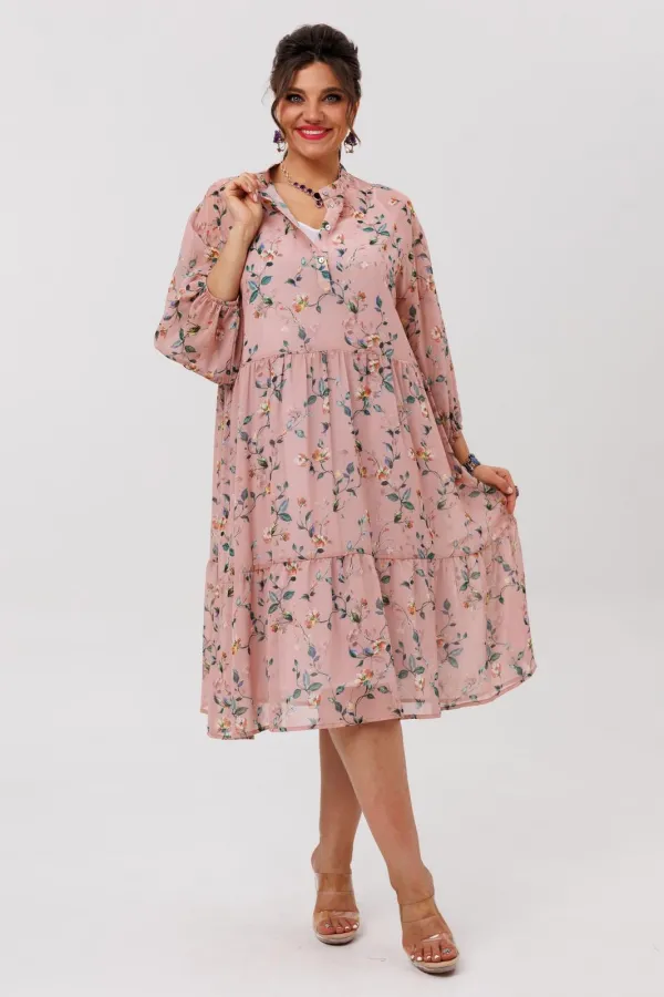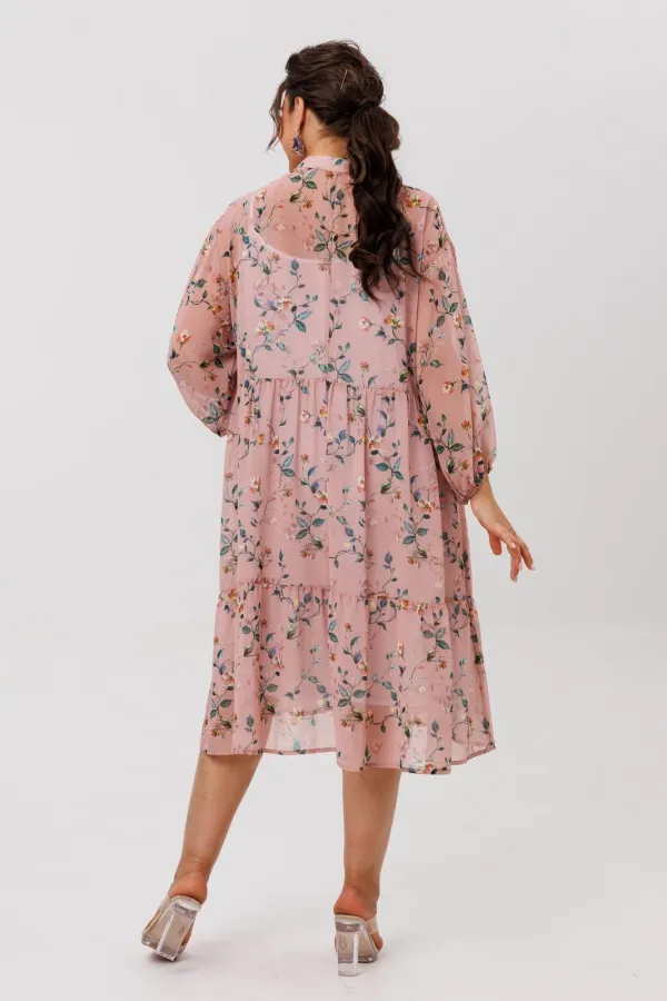 Лёгкое, воздушное платье из шифоновой ткани с флористическим принтом «пудровый сад» создаёт настроение движения и свободы. Свободный силуэт мягко струится по фигуре, позволяя чувствовать себя легко и непринуждённо, а актуальный крой делает модель универсальной для разных образов - от повседневных до более нарядных.