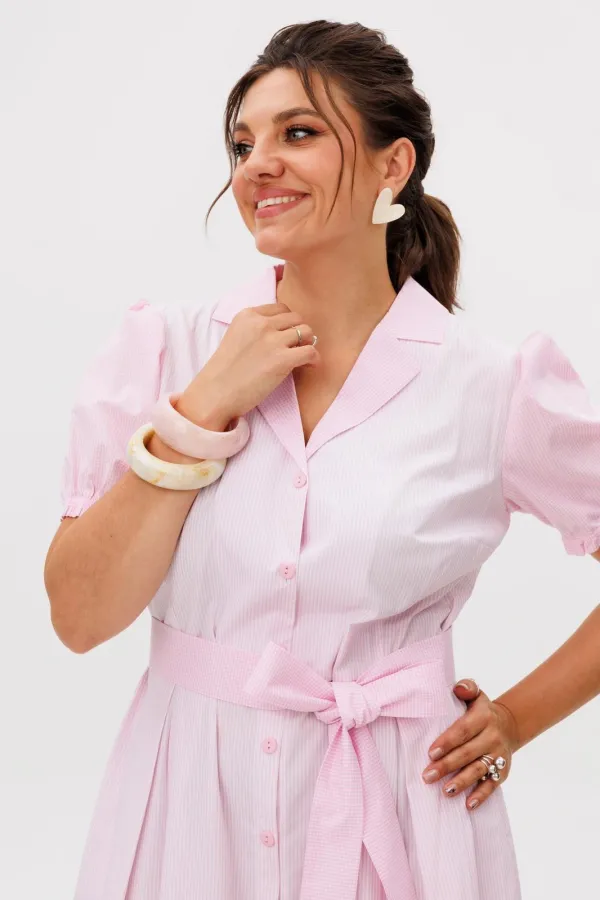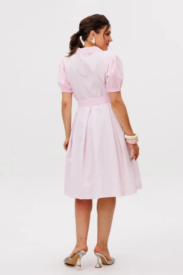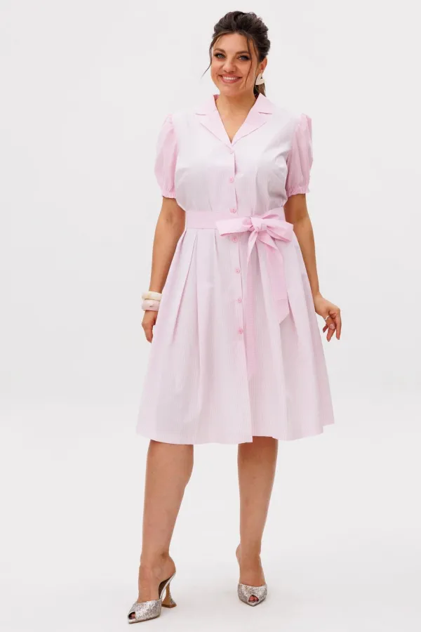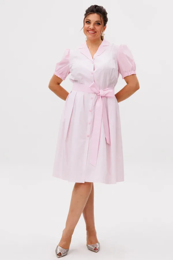 Нижняя часть платья с двумя встречными складками по переду и спинке от линии талии создаёт красивое движение ткани при каждом шаге, добавляя образу воздушности и деликатного объёма. Хлопковая ткань в мелкую полоску выглядит свежо и утончённо, а детали из ткани-компаньона в такую же мелкую клеточку - втачной короткий рукав-фонарик, отложной воротник с лацканами и съёмный завязывающийся пояс - придают образу особое очарование и делают его по-настоящему выразительным.
