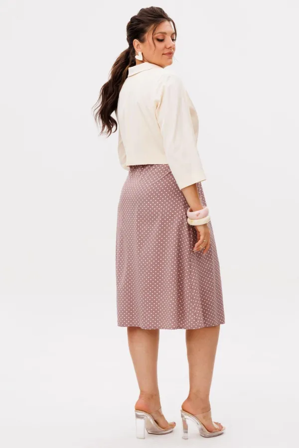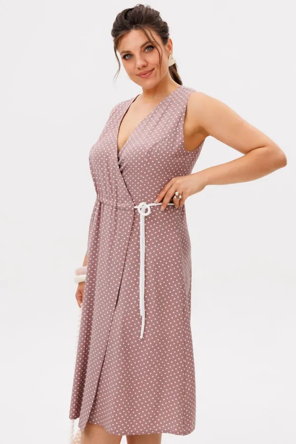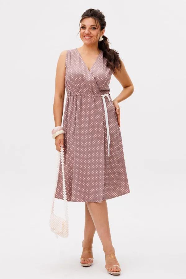 Длина ниже колена деликатно вытягивает силуэт, а конструкция на запах красиво адаптируется к любой фигуре, подчёркивая достоинства и создавая ощущение естественного комфорта. Нежная вискозная ткань мягко струится при движении, даря лёгкость и приятные тактильные ощущения, а актуальный горошковый принт в кремовом оттенке добавляет образу свежести и романтичного настроения. Пояс на кулиске позволяет регулировать посадку, создавая идеальный силуэт и ощущение свободы.