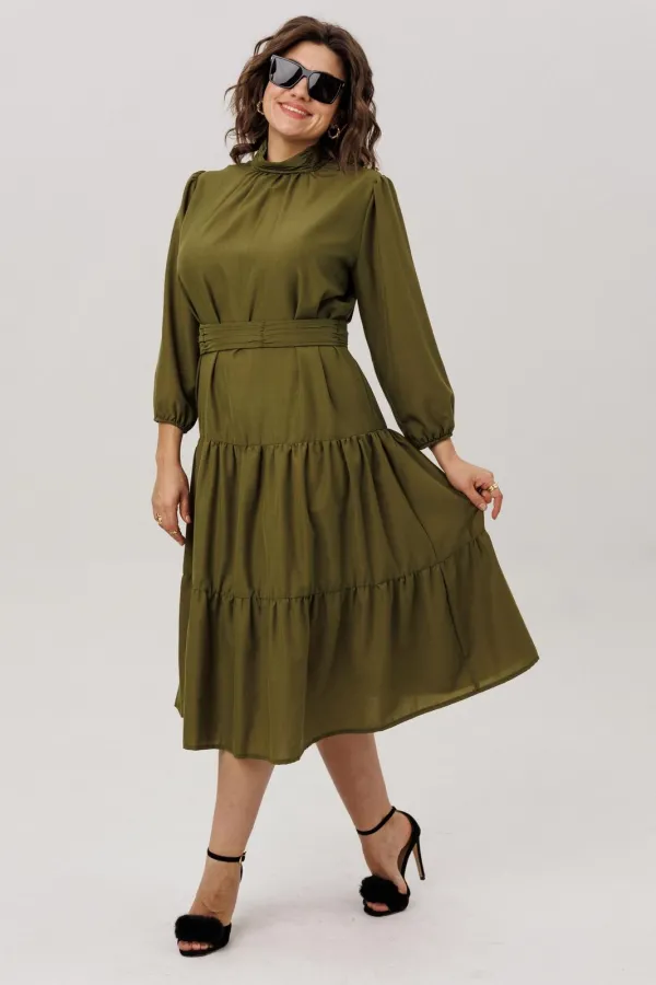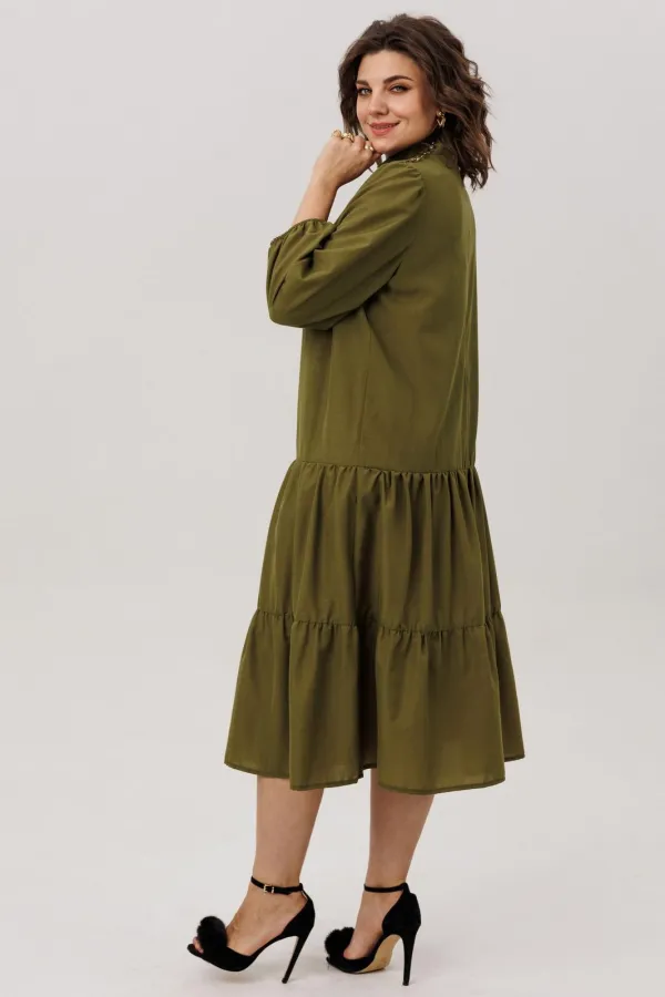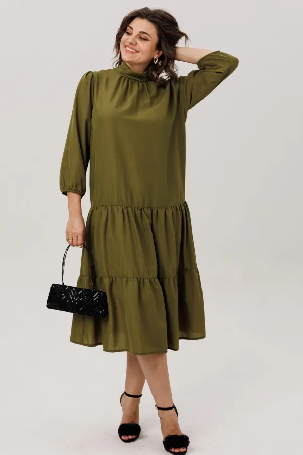Свободный силуэт этого платья в цвете «испанская оливка» словно создан для городского ритма, придавая ярким будням лёгкость и особый шарм.