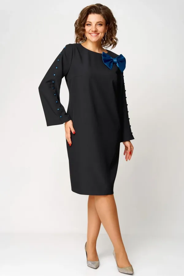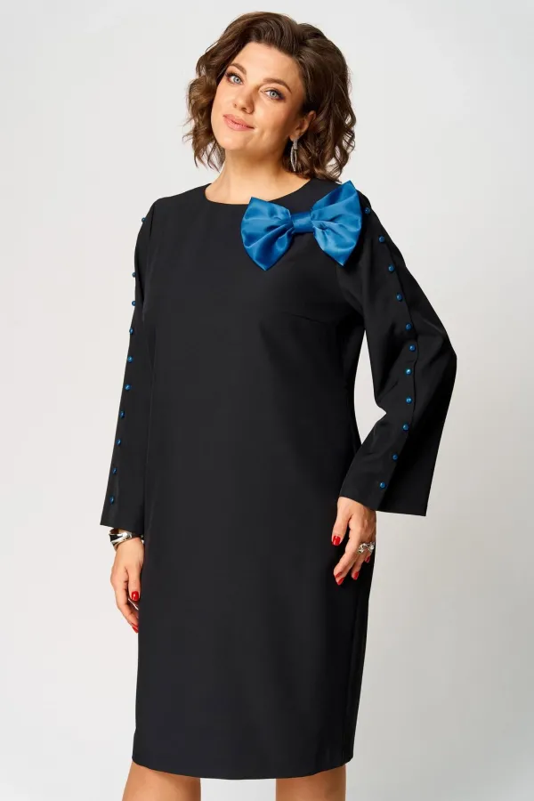 Платье женское полуприлегающего силуэта из костюмно-плательной ткани. Горловина округлой формы. Перед с нагрудными вытачками. Спинка с талиевыми вытачками, застежкой на молнию и разрезом в среднем шве. Рукав втачной прямой длинный с разрезом и декоративной застежкой на петли и пуговицы. По низу платья в боковом шве высокий разрез. Декорировано платье съемным бантом.