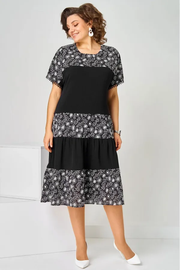 Платье женское летнее, полуприлегающего силуэта из хлопковой ткани двух видов, по низу кружево. Горловина округлая. Рукав спущенный. По переду кокетка, платье отрезное по линии бедер с тремя рядами присборенных воланов. Спинка свободная. Вверху застежка на петлю. К платью прилагается пояс.Длина изделия 111 (±2) см.