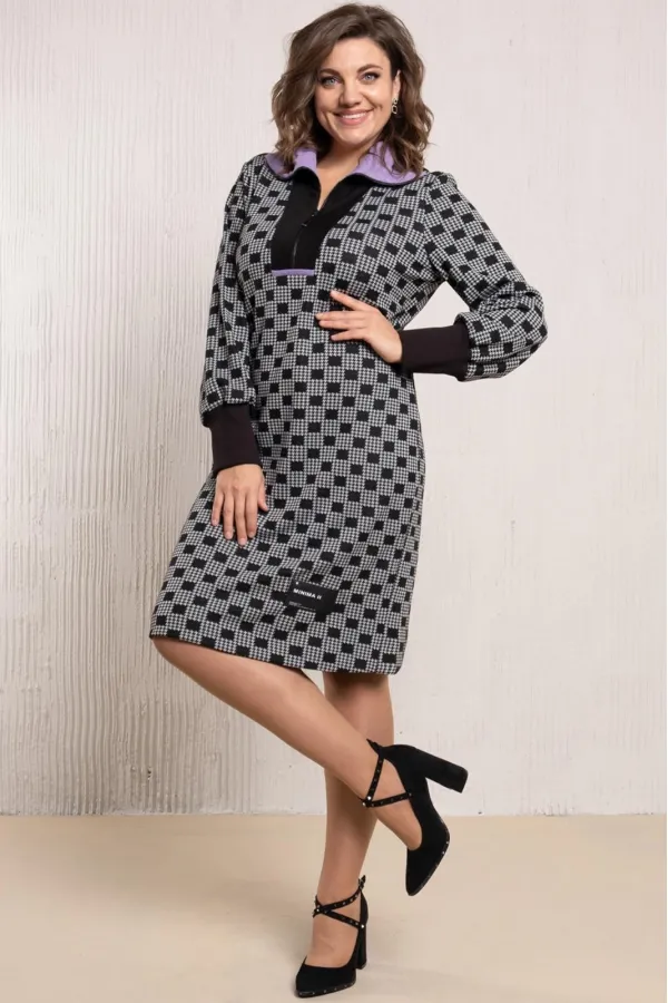 Трикотажное платье полуприлеающего силуэта. Трикотаж плотный, но эластичный. Рукав втачной, застежка на молнию спереди. Длина изделия по спинке в 46-48-50 размерах 96 см, 52-54-56 размерах 99 см.