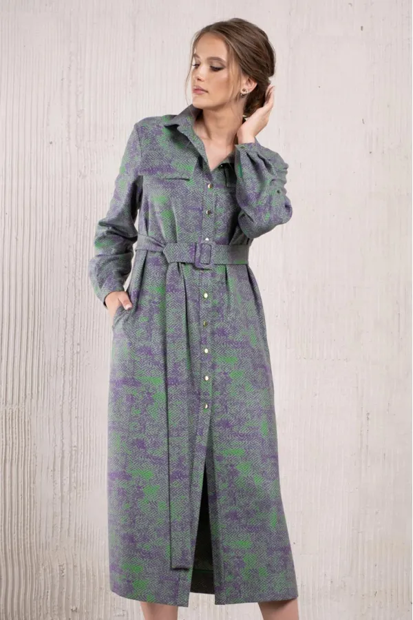 Стильное, удобное платье-рубашка с поясом. Ткань костюмно-плательная средней плотности, на ощупь мягкая, приятная. Рукав втачной, низ на манжете. На переде застежка на пуговицы и имитация карманов. В боковых шах удобные карманы и разрезы. Внутренние швы окантованы. Пояс в комплекте, съемный. Длина платья 127 см, рукава 61 см.
