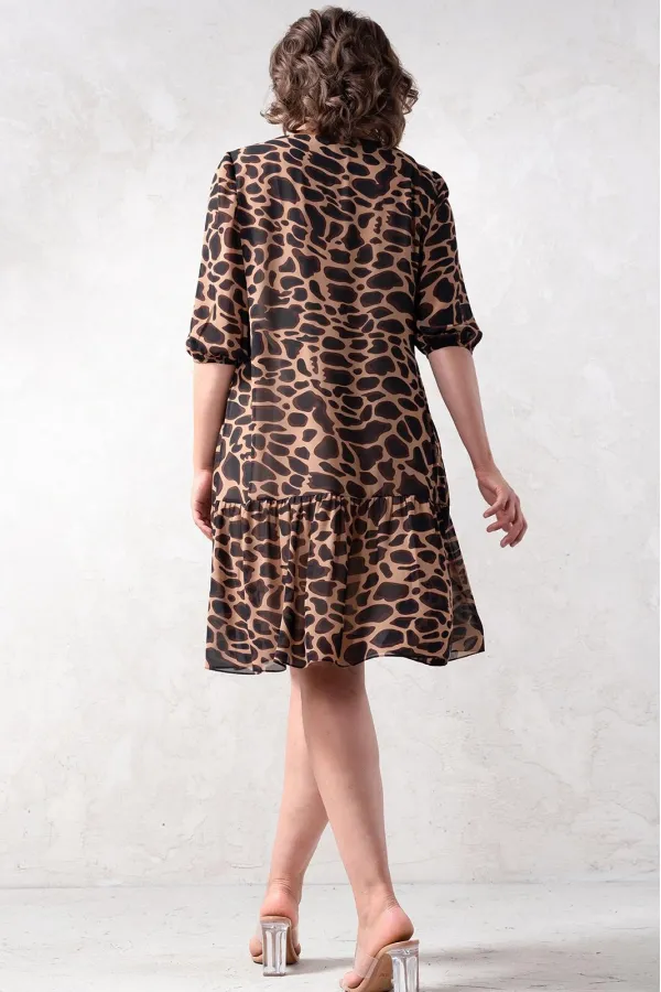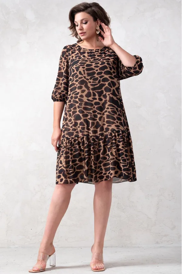 Шифоновое платье с воланом. Силуэт свободный. Изделие на трикотажном подкладе. Рукав втачной, низ рукава на резинке. Длина изделия 98 см, рукава 46 см.