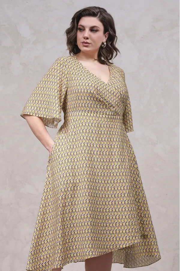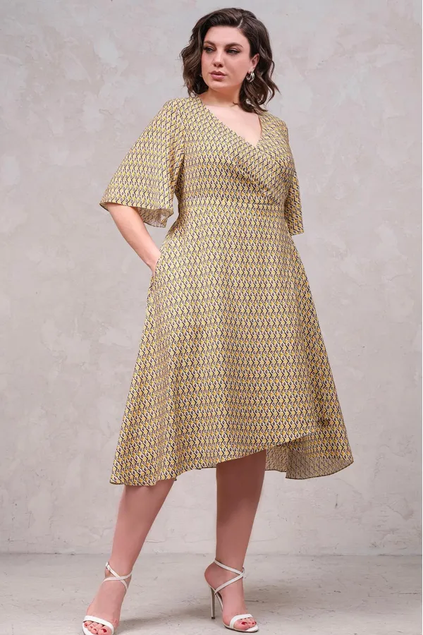 Платье А-силуэта на запах из вискозы, длиной до середины икры, отрезное по линии талии. V-образный вырез по горловине, рукав расклешенный длиной до локтя. В боковых швах - карманы, по спинке по талии - резинка.
