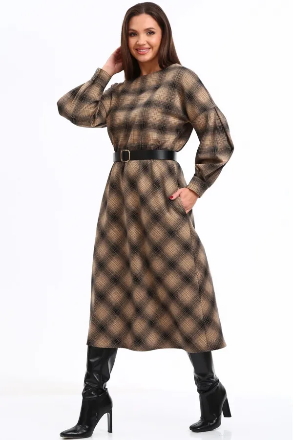 Уютное трикотажное платье  в клетку с 3D эффектом в трендовой расцветке, безусловно, станет фаворитом в Вашем гардеробе. Изделие выполнено из высококачественного турецкого, приятного к телу вискозного трикотажа. Платье А-образного силуэта, отрезное по линии талии. Рукава спущенные с активными защипами, полной длины, с притачными манжетами с застежкой на петли-пуговицы. Горловина мягкой округлой формы. Нижняя часть платья покроя трапеция. В боковых швах предусмотрены функциональные карманы. В области талии платье присобрано на эластичную тесьму. Платье дополнено стильным съёмным ремнем.