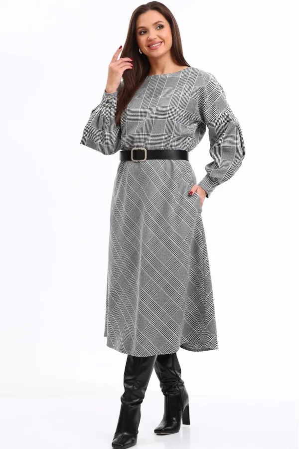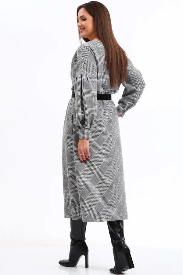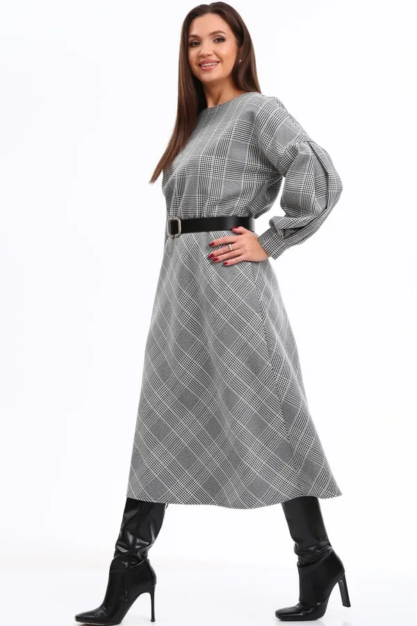 Стильное платье  в клетку  в трендовой расцветке, безусловно, станет фаворитом в Вашем гардеробе. Изделие выполнено из высококачественной ткани, приятной к телу. Платье А-образного силуэта, отрезное по линии талии. Рукава спущенные с активными защипами, полной длины, с притачными манжетами с застежкой на петли-пуговицы. Горловина мягкой округлой формы. Нижняя часть платья покроя трапеция. В боковых швах предусмотрены функциональные карманы. В области талии платье присобрано на эластичную тесьму. Платье дополнено стильным съёмным ремнем.