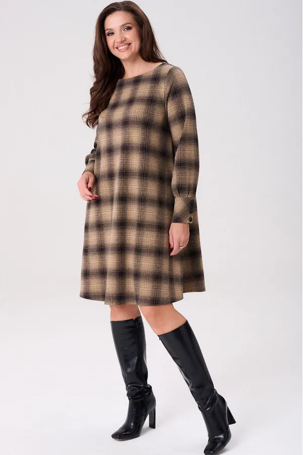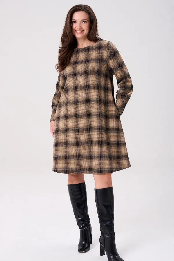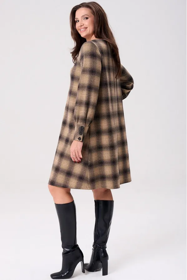 Стильное молодежное платье трапециевидного силуэта из высококачественного турецкого трикотажа. Изделие выгодно подчеркивает достоинства фигуры, скрывая при этом недостатки. Вырез горловины округлой формы. Рукав полной длины, оформлен притачной манжетой  застегивающейся на ряд декоративных пуговиц. В боковых швах предусмотрены функциональные карманы. Уютное трикотажное платье  в клетку с 3D эффектом в трендовой расцветке, безусловно, станет фаворитом в Вашем гардеробе.Длина рукава 62 см