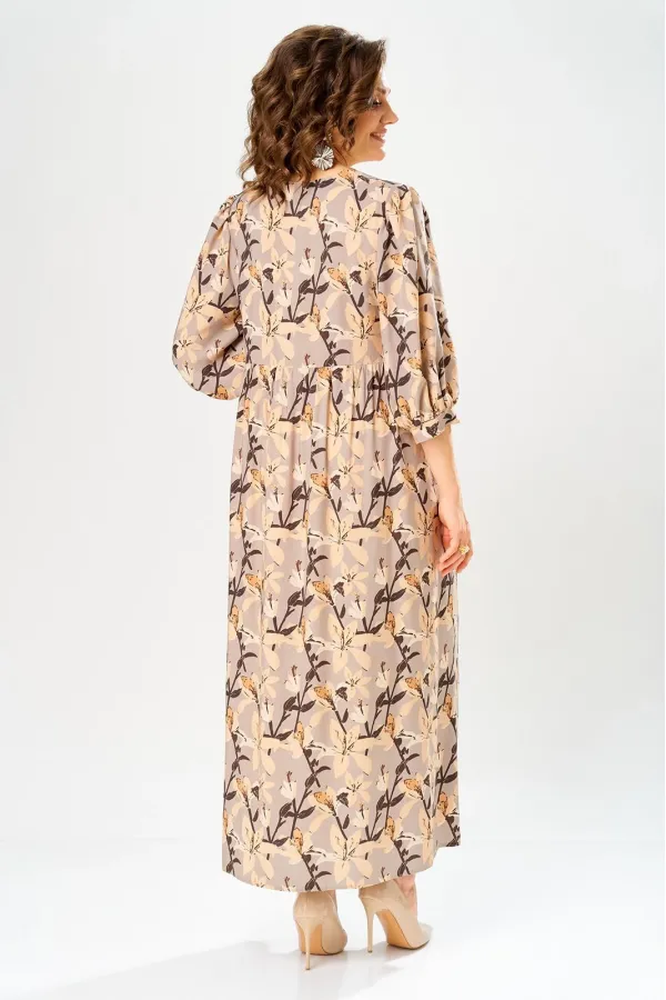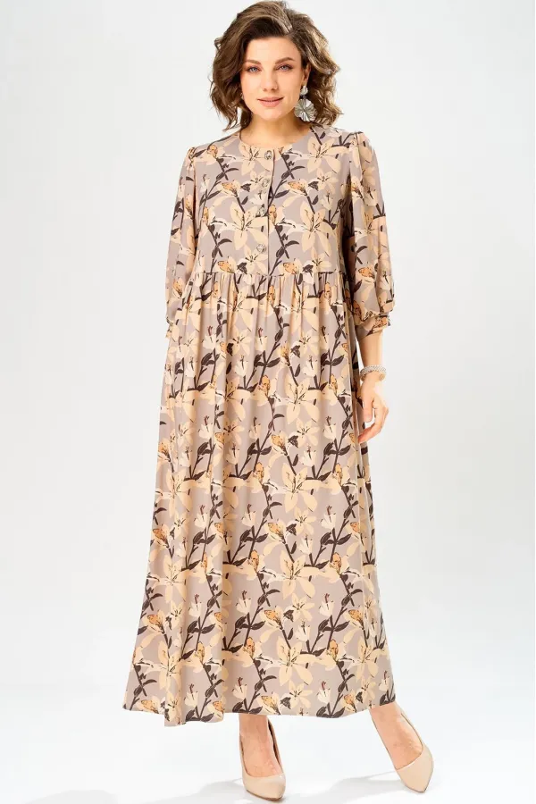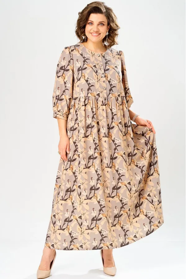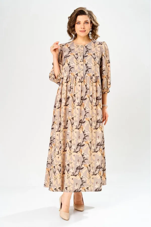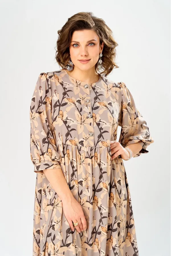 Платье со слегка завышенной линией талии. Лиф платья выполнен с застежкой на петли-пуговицы. Рукав втачной одношовный, со сборкой по линии оката, низ рукава оформлен манжетой.