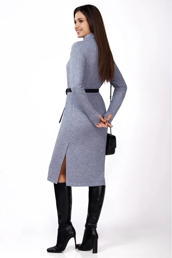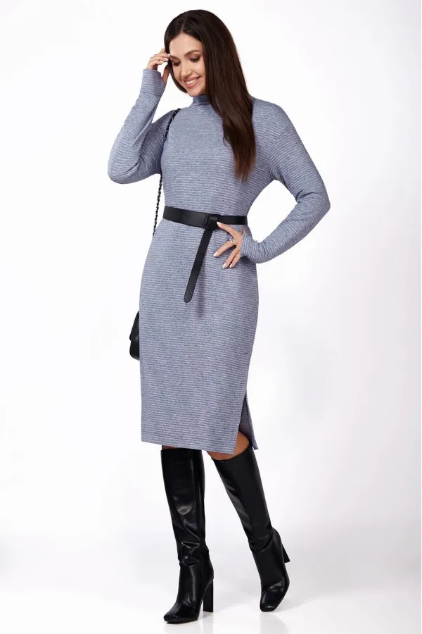 Платье женское полуприлегающего силуэта выполнено из трикотажного полотна в рубчик. Перед и спинка с цельнокроеным воротником- стойкой. Проймы слегка спущены. Слева вдоль бокового шва шлица. Рукава длинные с цельнокроеными митенками.