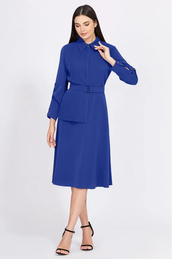 Лёгкое, струящееся платье X-образного силуэта длины миди, с интересным кроем рукавов и рубашечным воротником на стойке, выполнили из приятной, однотонной ткани. Лиф переда платья с застёжкой на петли и пуговицы дополнили отделочной деталью со складками на одно плечо. Линию талии красиво подчёркивает пояс в тон с контрастными пряжками.