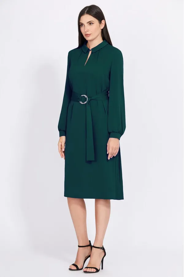 Просто и стильно! Ваш образ будет моментально готов с этим интересным платьем. Модель прямого силуэта выполнили из мягкой, приятной, однотонной ткани и дополнили щелевидным вырезом со сборкой по горловине,  отложным воротником с застёжкой на навесную петлю и ювелирную пуговицу, функциональными карманами в боковых швах и деталью со складками по спинке, предоставляющую вам массу свободы и стиля. Рукава втачные, сосборенные по низу манжетами, с застёжкой на ювелирные пуговицы.  Для создания приталенного силуэта, предусмотрен интересный пояс в тон, красиво подчёркивающий талию.