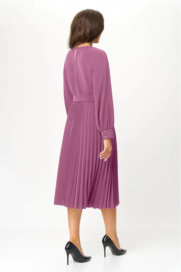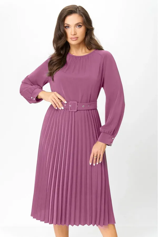 Это красивое платье, идеально подходящее для любого типа фигуры – безупречное предложение для тех женщин, которые любят оригинальную элегантность. Изделие сшили из мягкой, приятной, немнущейся ткани. Модель Х-образного силуэта длины миди, с округлой формой горловины со сборкой по переду и рукавами-реглан, сосборенными по низу манжетами и застёгивающимися на ювелирные пуговицы. В среднем шве спинки лифа обработана застёжка на навесную петлю и пуговицу. Платье привлекает к себе внимание также благодаря плиссированной юбке, придающей фигуре изящные движения. Линия талии акцентирована скрытой резинкой и красиво подчёркнута поясом с пряжкой в тон.