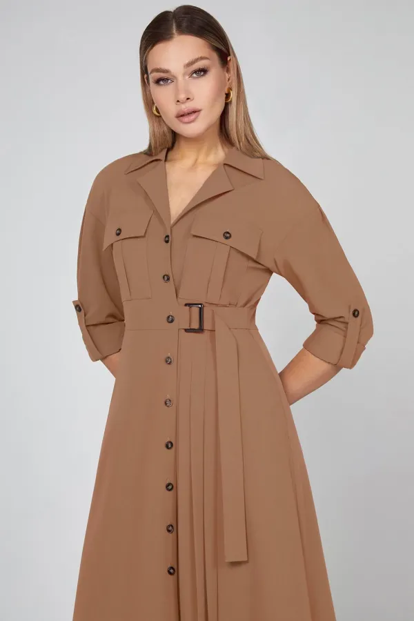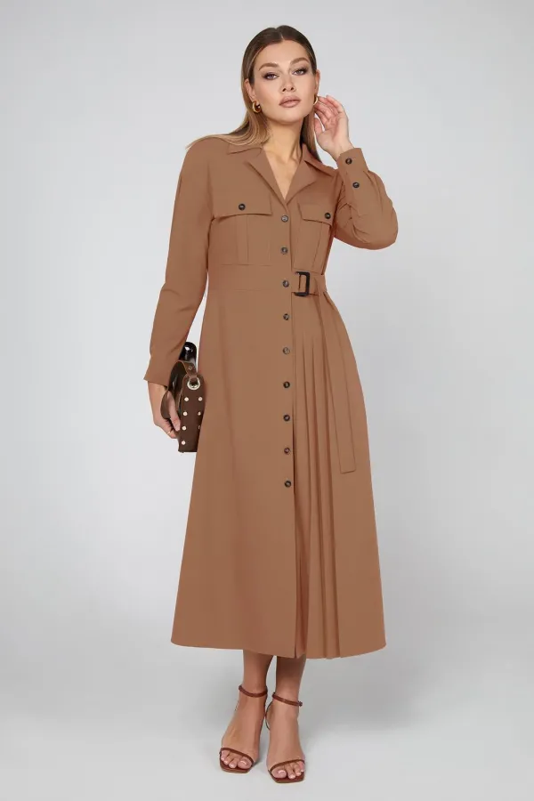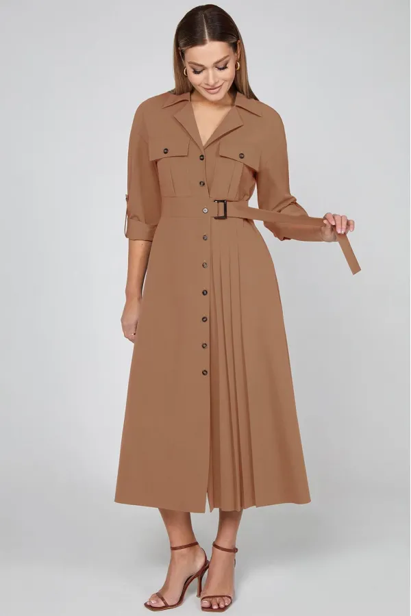 Просто фантастика! Это изысканное платье длиной мидакси с женственным кроем идеально дополняется аккуратным воротником с лацканами и пояском с пряжкой. Дизайн дополняется карманами с клапанами на груди, спущенной линией плеч с притачными рукавами с манжетами, которые при желании можно подвернуть и зафиксировать при помощи пат и пуговиц. Застежка на пуговицы по всей длине придаёт ему яркий штрих, а карманы в боковых швах добавляют функциональности. Вертикальные складки по детали переда завершают шикарный образ. Высококачественная испанская эластичная ткань также гарантирует износостойкость.