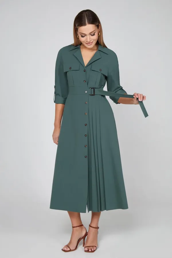 Просто фантастика! Это изысканное платье длиной мидакси с женственным кроем идеально дополняется аккуратным воротником с лацканами и пояском с пряжкой. Дизайн дополняется карманами с клапанами на груди, спущенной линией плеч с притачными рукавами с манжетами, которые при желании можно подвернуть и зафиксировать при помощи пат и пуговиц. Застежка на пуговицы по всей длине придаёт ему яркий штрих, а карманы в боковых швах добавляют функциональности. Вертикальные складки по детали переда завершают шикарный образ. Высококачественная испанская эластичная ткань также гарантирует износостойкость.