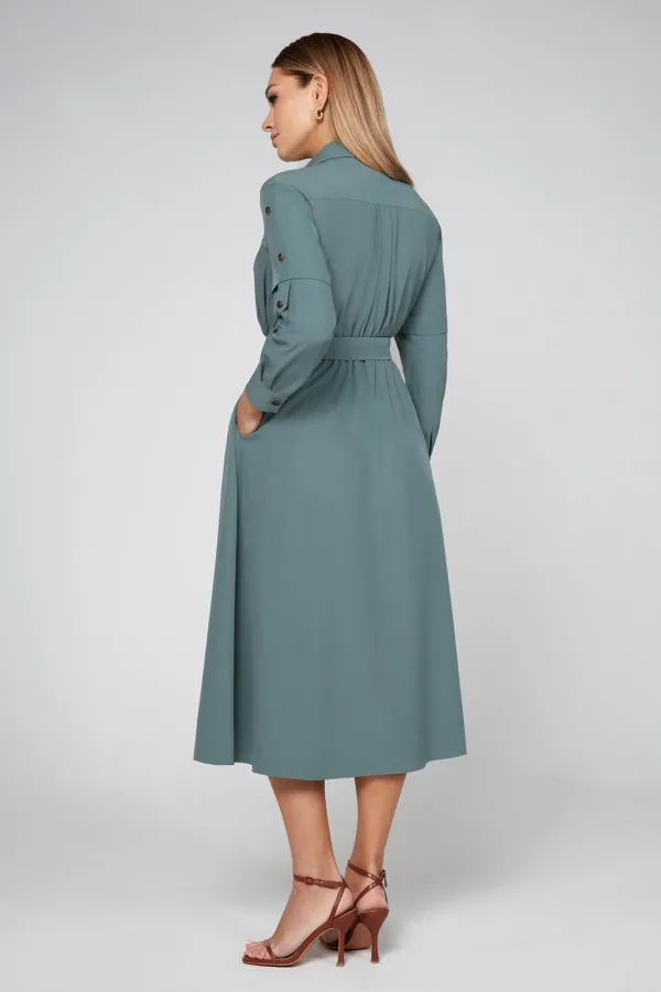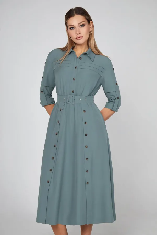 Стильное платье-рубашка с длинным рукавом и расклешенным кроем — идеальное сочетание легкости и элегантности. Модель со спущенной линией плеч выполнена из приятной вискозной испанской ткани и дополнена интересными элементами, придающими ей спортивный и динамичный характер. Отложной воротник и планка на пуговицах добавляют очарования, а рукава с манжетами можно закатать и зафиксировать при помощи паты и пуговицы, для создания непринужденного образа. Вертикальные складки , декоративные планки по юбке платья и отделочные пуговицы подчеркивают оригинальность этой модели, а карманы в боковых швах добавляют функциональности. Скрытая резинка на талии обеспечивает удобную посадку по фигуре, а пояс в тон с D-пряжками красиво подчеркивает талию.