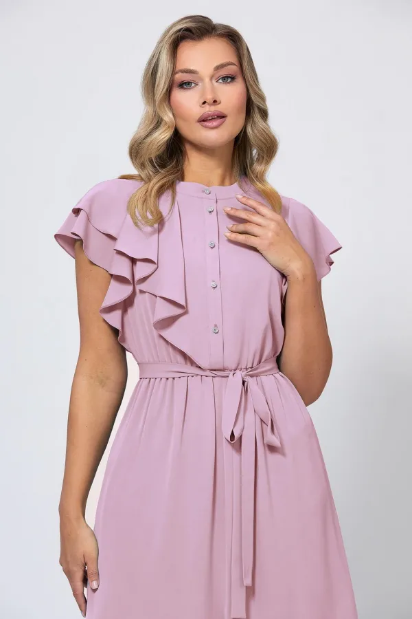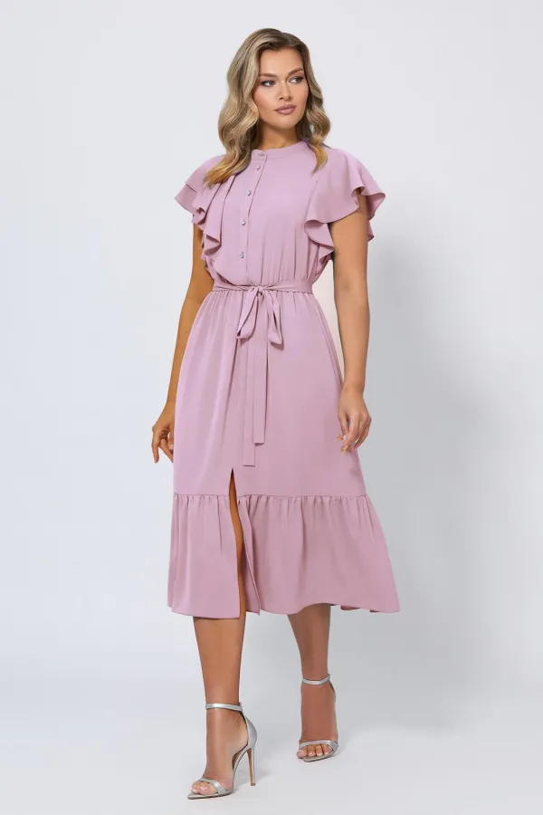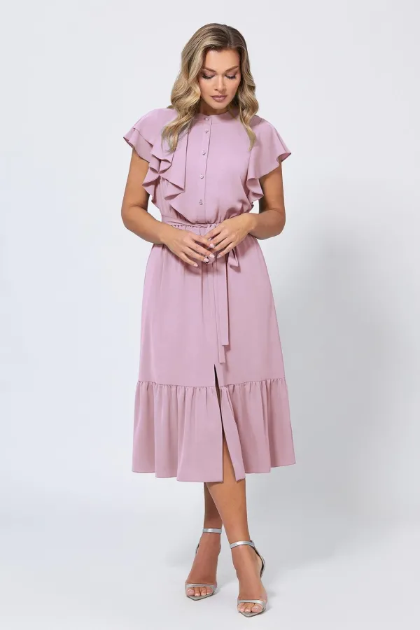 Это женственное платье X-образного силуэта длины миди с интересными деталями - стильное заявление для особых моментов. Нежный цвет и приятная к телу немнущаяся ткань придают модели элегантный вид. Красивая отделка оборками и жабо добавляет выразительности, а разрез по переду красиво смотрится во время движения. Ювелирные пуговицы по планке спереди несут не только функциональный характер, но и добавляют изысканности образу. Скрытая резинка на талии обеспечивает удобную посадку. Тонкий поясок можно завязать бантом, который станет ещё одним украшением платья.