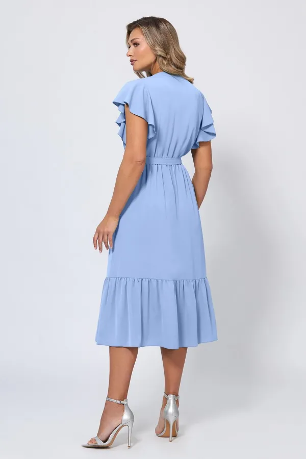 Это женственное платье X-образного силуэта длины миди с интересными деталями - стильное заявление для особых моментов. Нежный цвет и приятная к телу немнущаяся ткань придают модели элегантный вид. Красивая отделка оборками и жабо добавляет выразительности, а разрез по переду красиво смотрится во время движения. Ювелирные пуговицы по планке спереди несут не только функциональный характер, но и добавляют изысканности образу. Скрытая резинка на талии обеспечивает удобную посадку. Тонкий поясок можно завязать бантом, который станет ещё одним украшением платья.