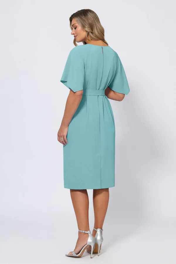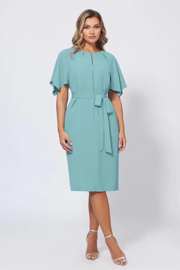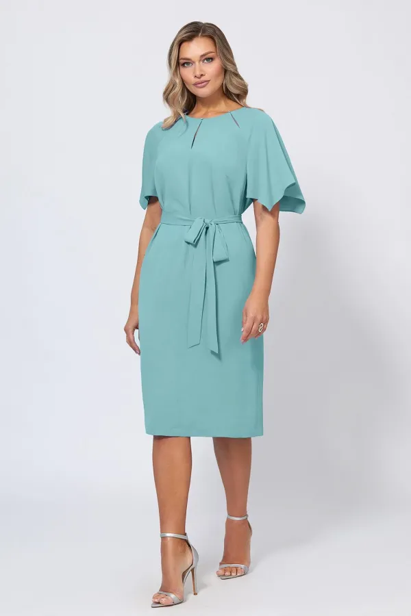 Элегантное платье с красивым декольте с мерцающими кристаллами придётся по душе ценителям нежного и женственного дизайна. А также дополнено интересными рукавами-крылышками, придающими романтичное настроение. В среднем шве спинки обработаны застёжка на навесную петлю-пуговицу и шлица. Модель выполнили из приятной немнущейся ткани, красиво струящейся во время носки. Прямой крой позволяет носить изделие как свободным, так и подчеркнув талию поясом-завязкой. Платье украсит любое событие — от семейного торжества до романтического вечера, а его уникальный дизайн всегда будет выделять его владелицу среди остальных.