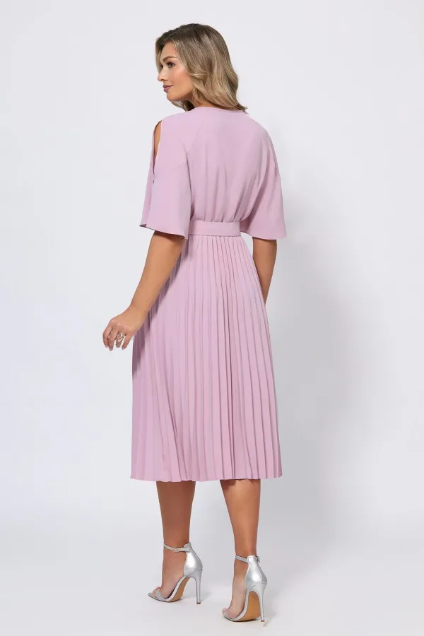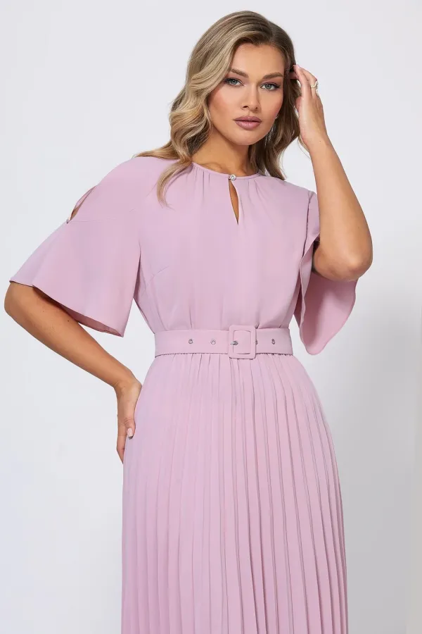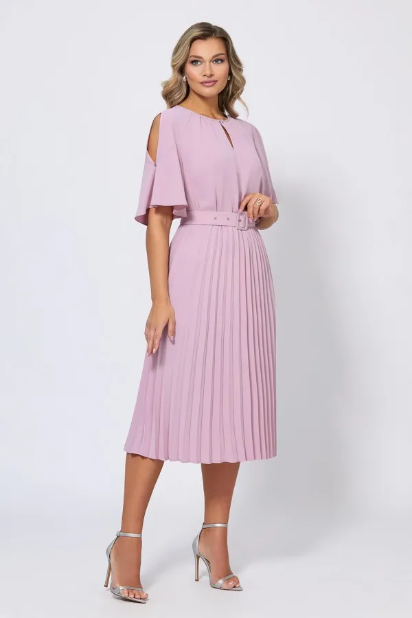 Элегантное и стильное платье с летящей плиссированной юбкой и рукавами-крылышками с кристаллами создает нежный и романтичный образ для торжественных случаев. Модель с округлой формой горловины со сборкой и каплевидной застёжкой на навесную петлю и ювелирную пуговицу по переду. Платье со скрытой резинкой на талии выполнили из приятной немнущейся ткани. Линия талии дополнительно красиво подчёркивается с помощью пояса-ремня с пряжкой в тон.