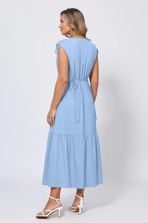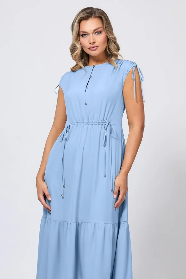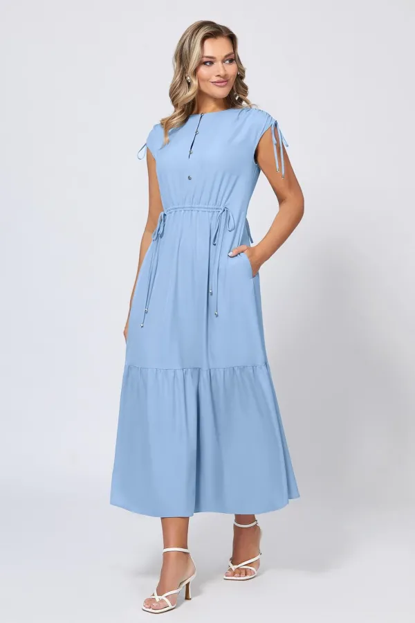 Эффектное платье длины мидакси со щелевидной застёжкой по переду на навесные петли и пуговицы. Модель с короткими цельнокроёными рукавами с функциональными кулисами,карманами в боковых швах и оборкой по низу. Линия талии по спинке и переду акцентирована кулисами, позволяющими добиться желаемого объёма. Лёгкая вискозная ткань приятна для кожи и красиво струится во время носки. Длина позволяет носить платье с обувью как на каблуке, так и на плоском ходу.