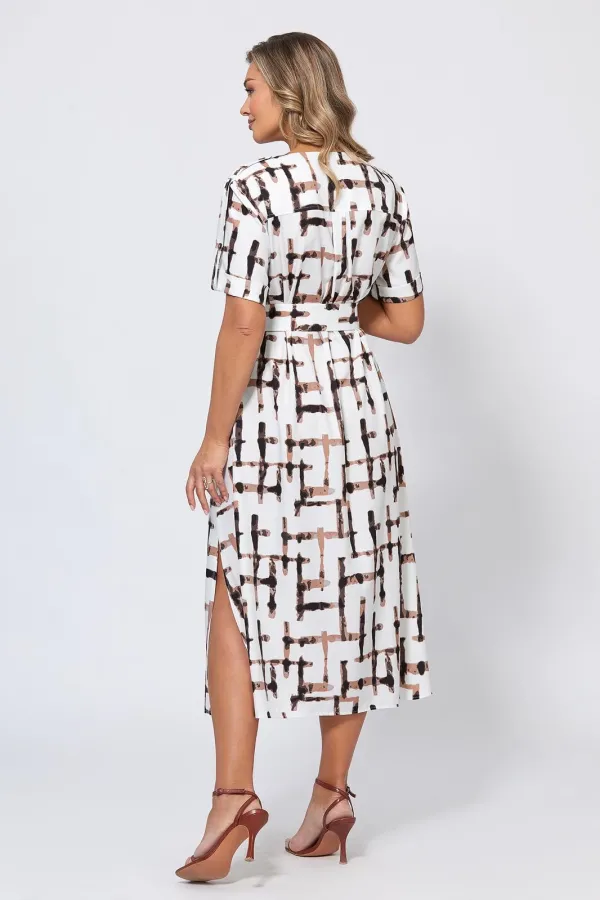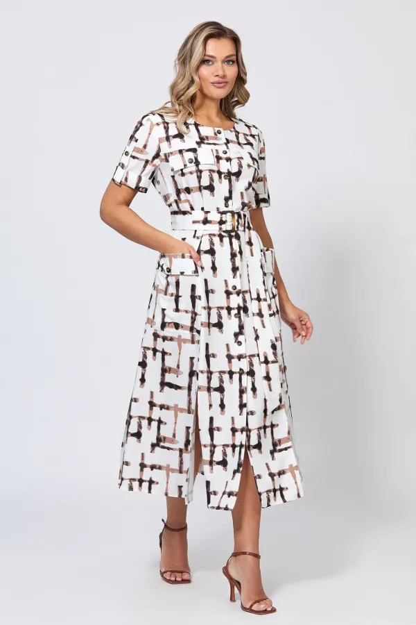 Это платье длины миди расклешённого кроя красиво садится по фигуре и придётся по душе ценителям элегантного дизайна. Модель: с округлым вырезом горловины; застёжкой на петли-пуговицы; с отделочными клапанами по переду; короткими рукавами с интересными отделочными патами и поясом из основной ткани, красиво подчёркивающим талию - сшита из экологичного дышащего материала на основе вискозы со стильным дизайном. Большие накладные карманы добавляют изделию функциональности, а разрезы в рельефах переда и в боковых швах добавляют силуэту динамики.