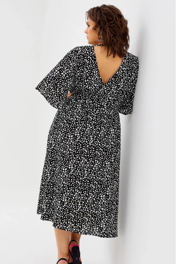 На спинке - соблазнительный V-образный вырез, который придаёт образу кокетливости и игривости. Верхнюю часть выреза фиксирует притачная планка из основной ткани, которая не предотвращает спадание платья с плеч.