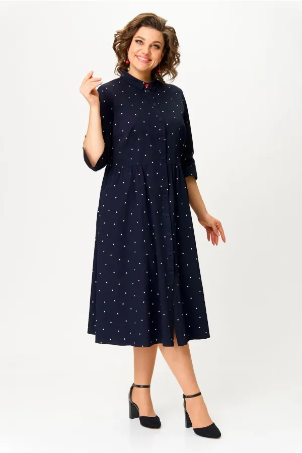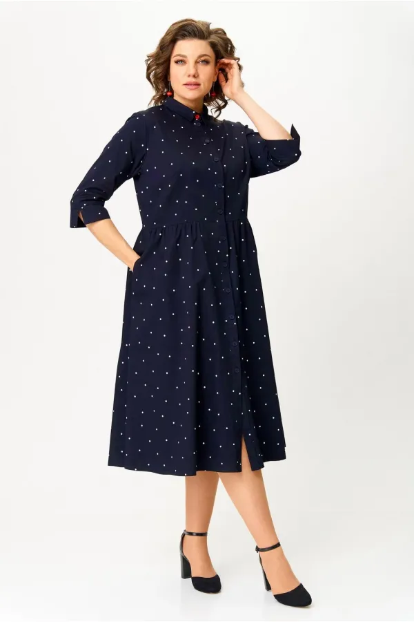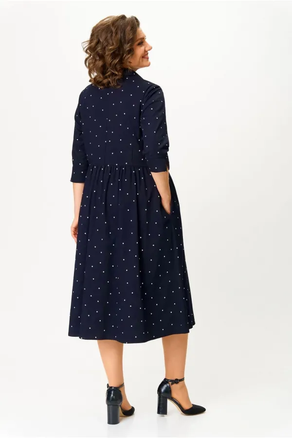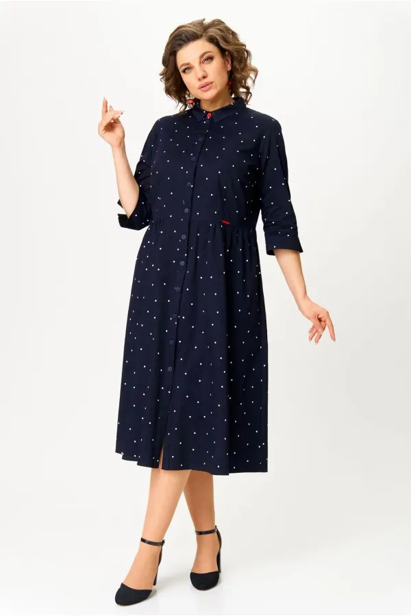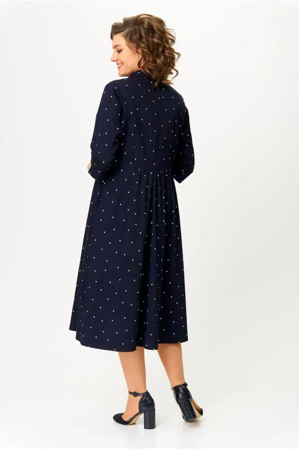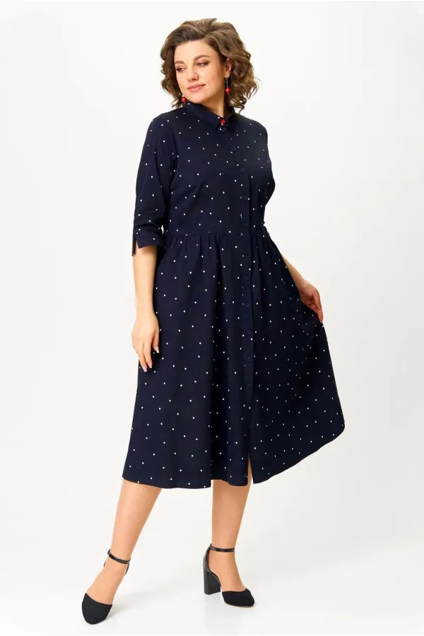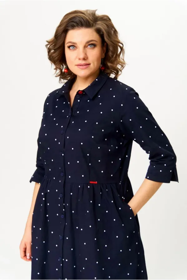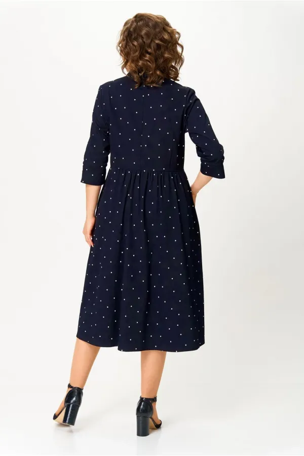 Платье женское, повседневное, полуприлегающего силуэта, отрезное по линии талии, длиной ниже линии колен, из хлопковой ткани. Перед с застежкой на пуговицы. Вырез горловины обработан воротником на стойке. Рукав втачной, по низу обработан цельнокроенной манжетой. Длина по спинке 117 см, длина рукава 16,5 см.