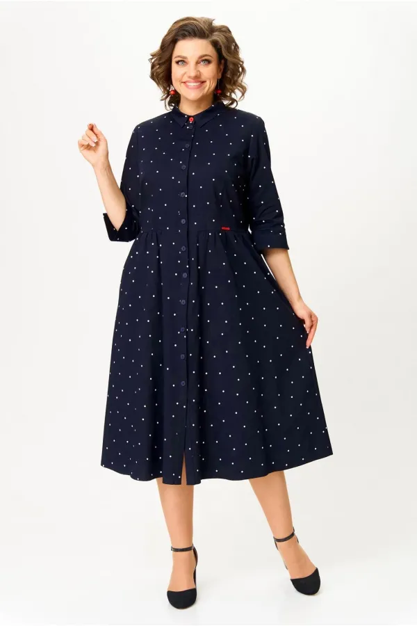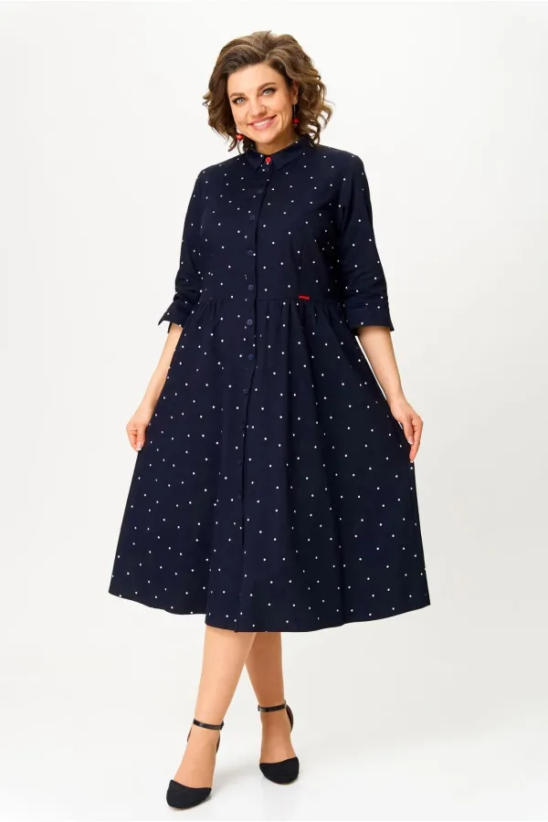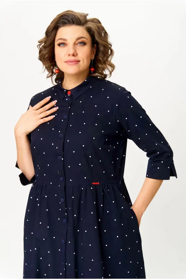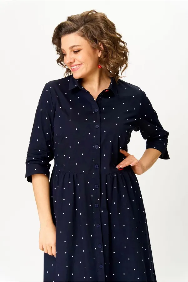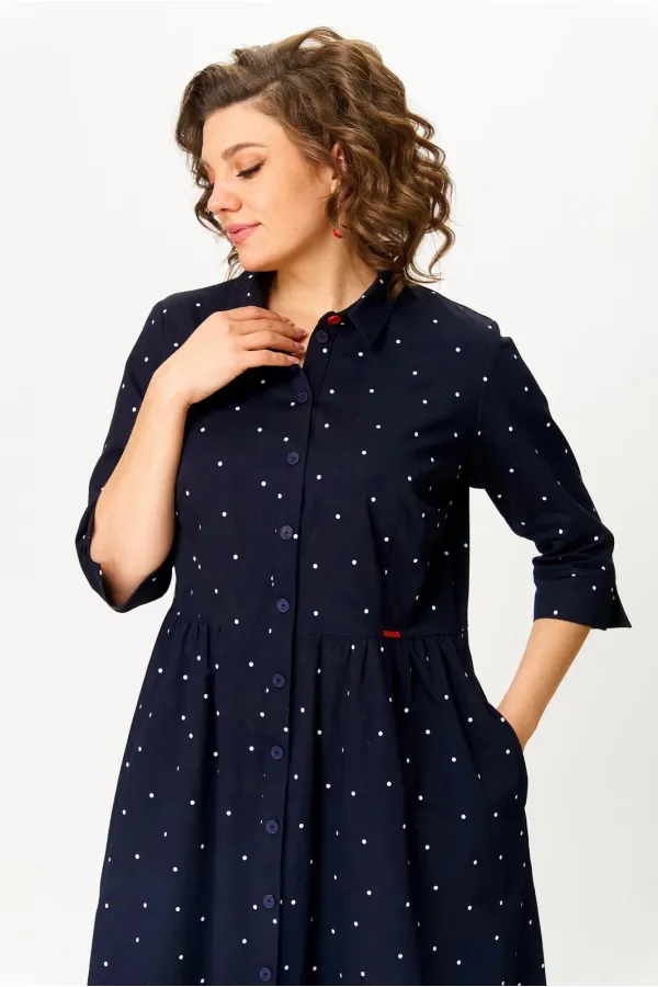 Платье женское, повседневное, полуприлегающего силуэта, отрезное по линии талии, длиной ниже линии колен, из хлопковой ткани. Перед с застежкой на пуговицы. Вырез горловины обработан воротником на стойке. Рукав втачной,... Читать далее...