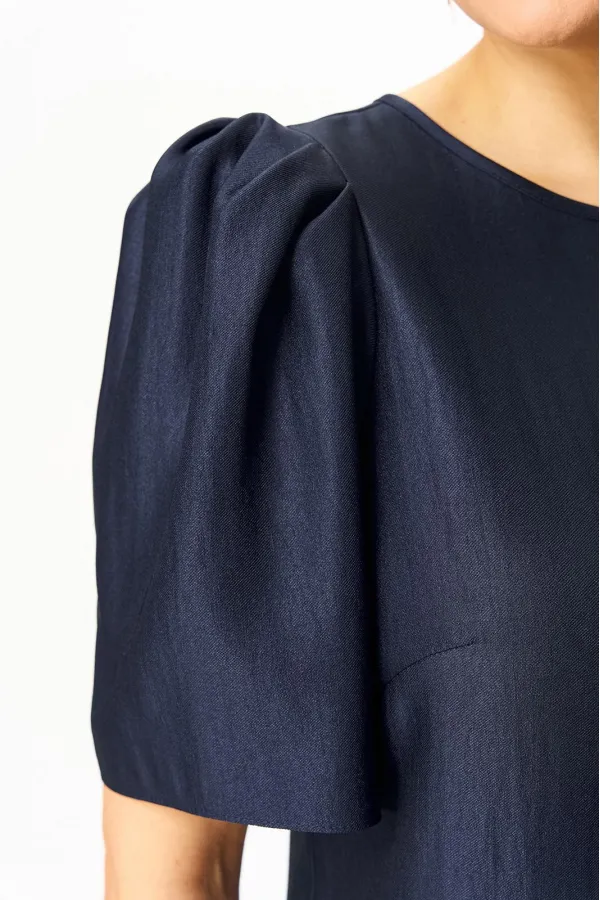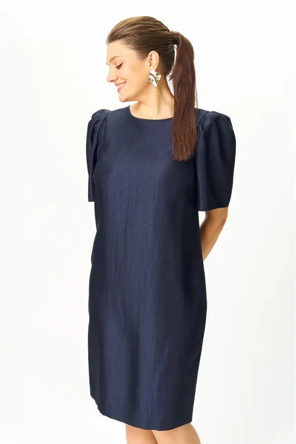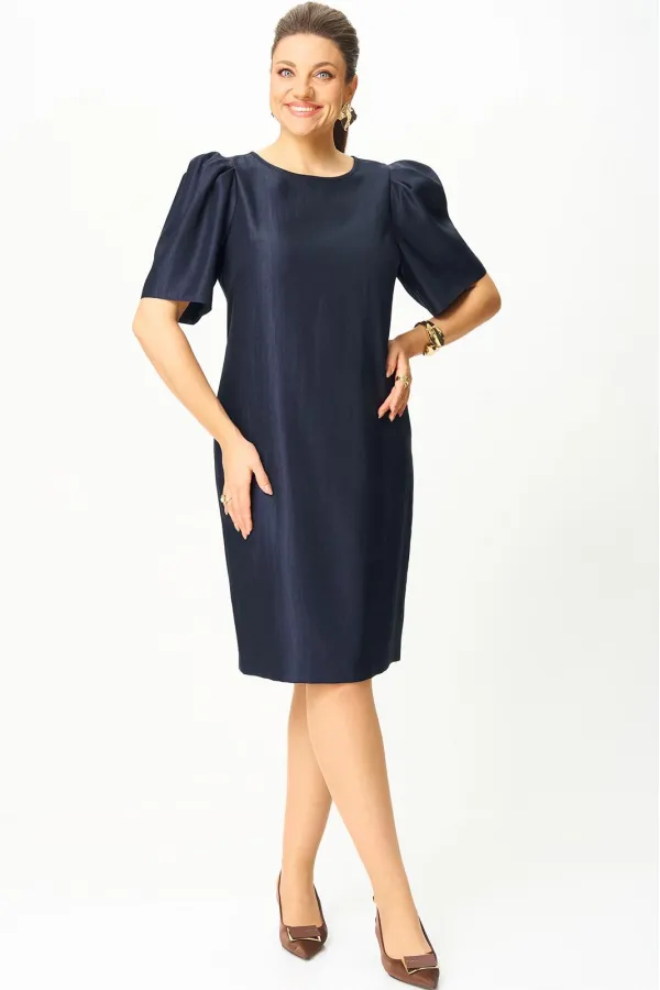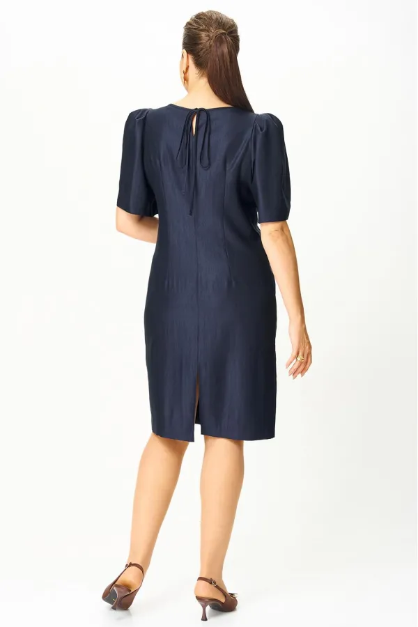 Платье полуприлегающего силуэта, горловина круглая. По спинке в центральном шве разрез возле горловины с завязкой и разрез по низу.