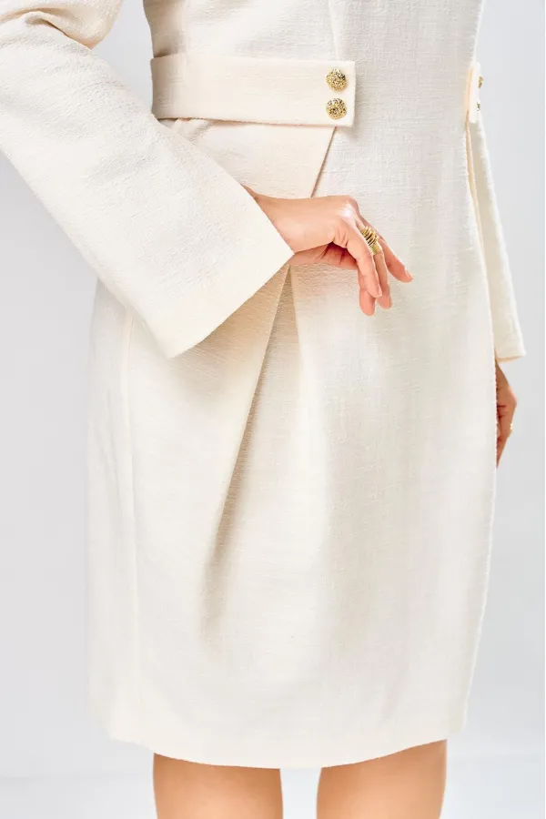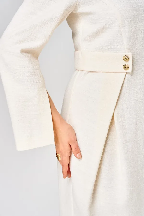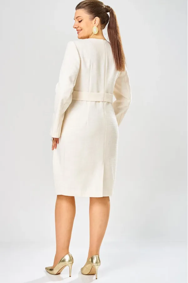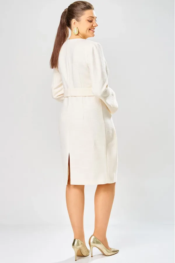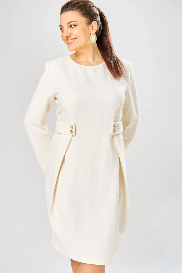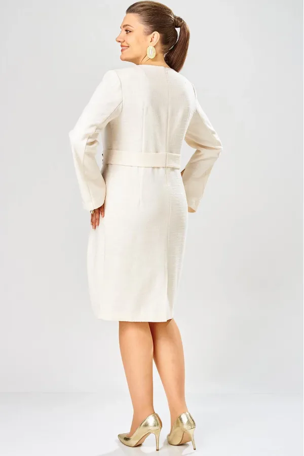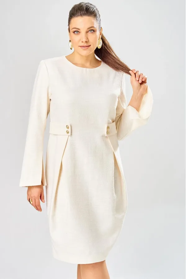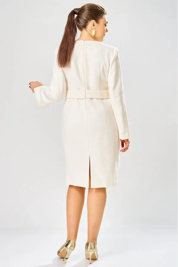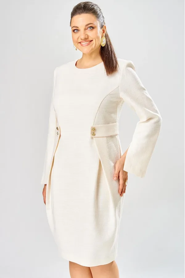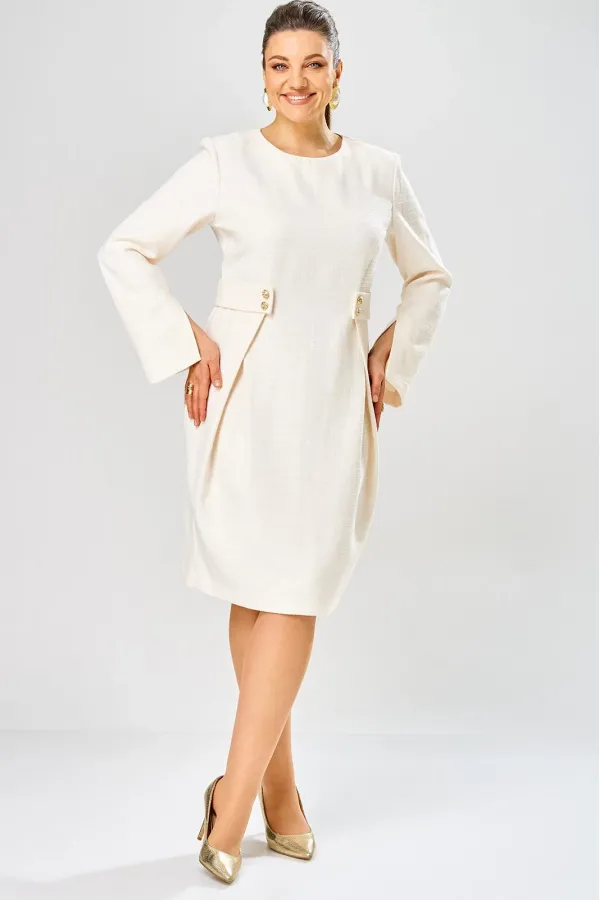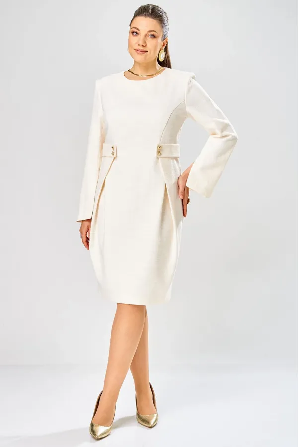 Платье полуприлегающего силуэта, по переду в верхней части лифа отрезные бочки. Горловина круглая, по линии талии декоративные элементы с пуговицами. Рукава втачные расширенные к низу, по переднему шву с разрезом. Застежка на тесьму молнию в среднем шве спинки.